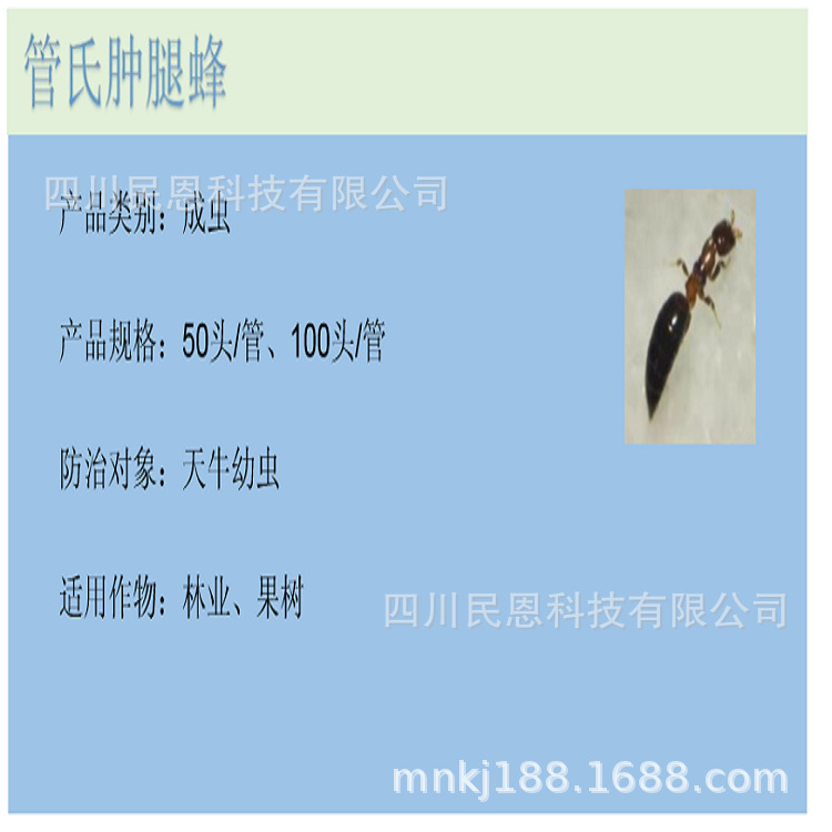管氏肿腿蜂,属膜翅目、肿腿蜂科下,是一种以鞘翅 目、鳞翅目等多种蛀干害虫(特别是天牛类)的幼虫和蛹 为寄主的体外寄生蜂。是天牛等多种蛀干害虫的重要寄生 性天敌,对于控制天牛危害具有重要作用。肿腿蜂一年的 发生代数随其种类及所在地区的气候不同而异。在河北、 山东一年发生 5 代,在粤北山区一年 5 代~6 代,在广州一 年可完成 7 代~8 代。肿腿蜂以受精雌虫在天牛虫道内群居 越冬,翌年 4 月上中旬出蛰活动,寻找寄主。其钻蛀能力极强,能穿过充满虫粪的虫道寻找到寄主。雌蜂爬行迅 速,1min 可爬行 0.5m 左右。