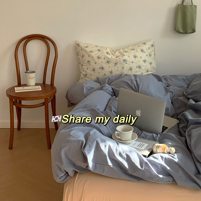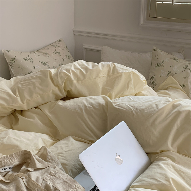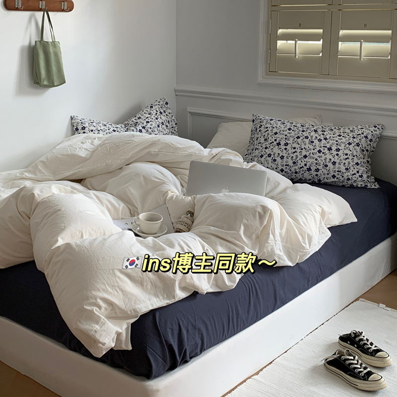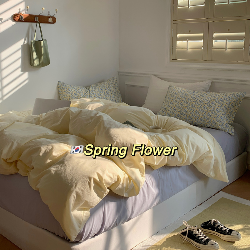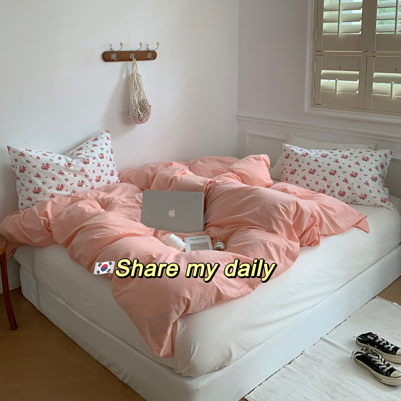 Корейский стиль, пасторальный цветочный комплект из чистого хлопка, состоящий из четырех предметов, однотонный, полностью хлопковый, 1,5 м, 1.8m г., приятный для кожи, простыня из стираного хлопка.