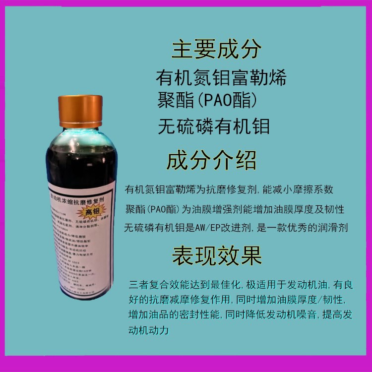 【加入方法】:热车从机油加注口加入,怠速15分钟,最好拉高转数,使抗磨层快速形成于气缸内壁。