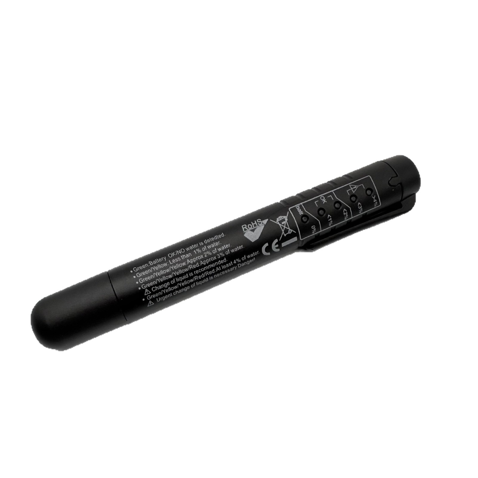 刹车油检测笔是用于检测制动液的品质,制动液含水量百分比的检测结果由测试笔上5个LED灯的点亮个数来显示。FT123刹车油检测笔根据电导率的变化来测定刹车油的水分变化,通过发光二极管清晰地显示含水分的程度,含水分高会导致沸点降低,影响刹车性能。红光表示刹车油需要更换,绿光表示状态良好,黄光表示状态尚可。