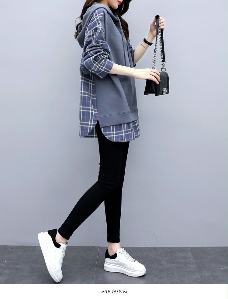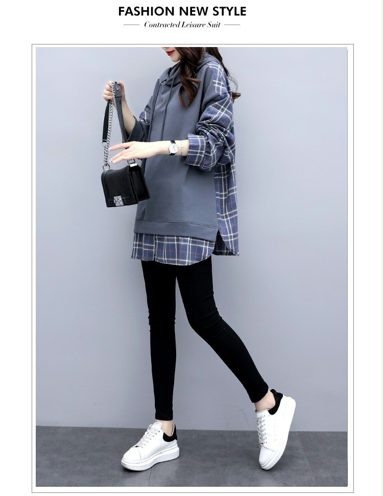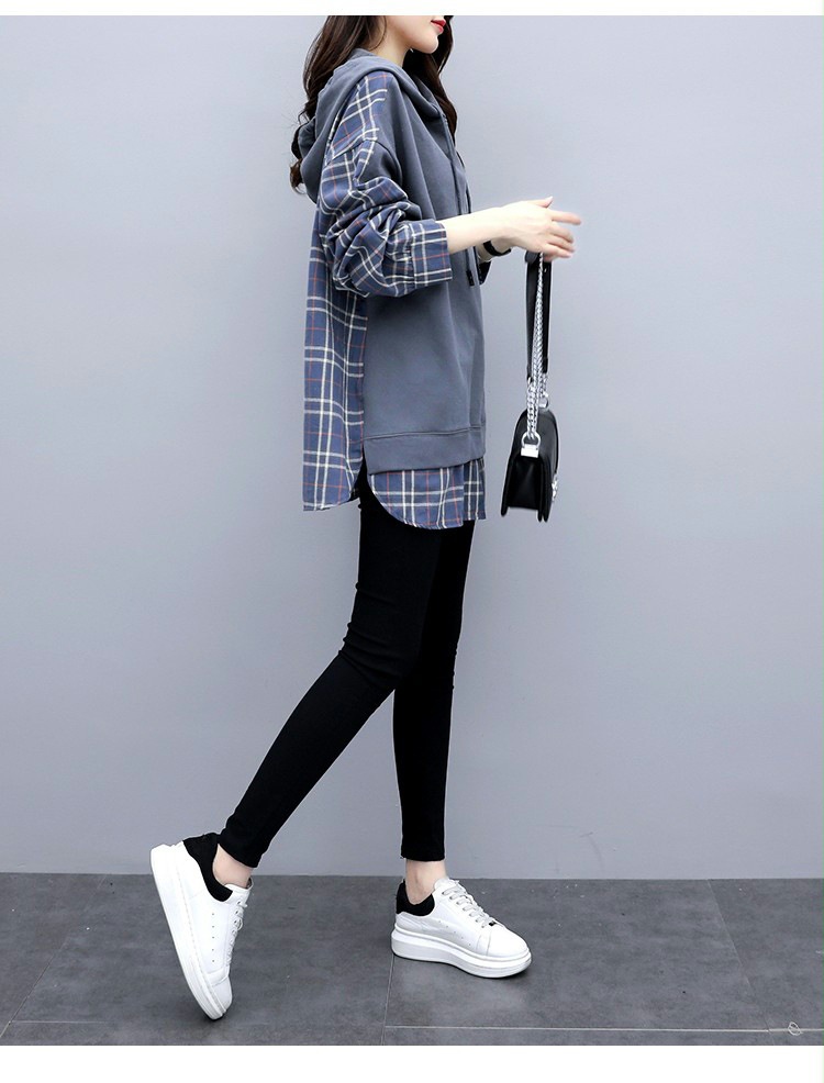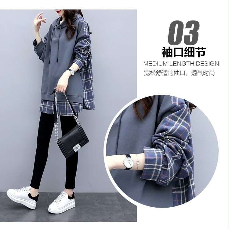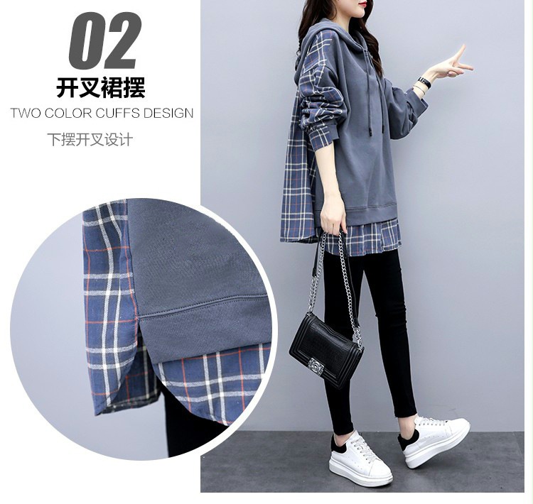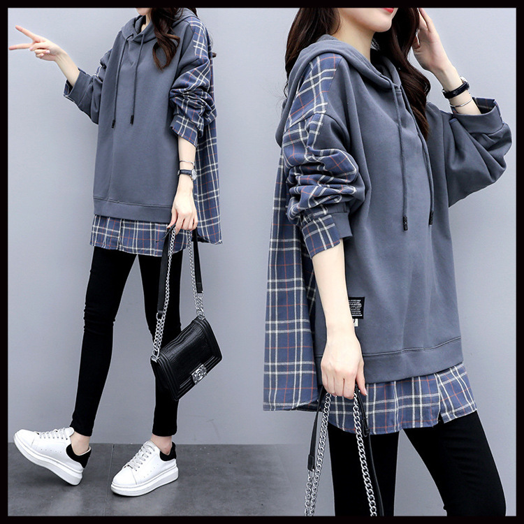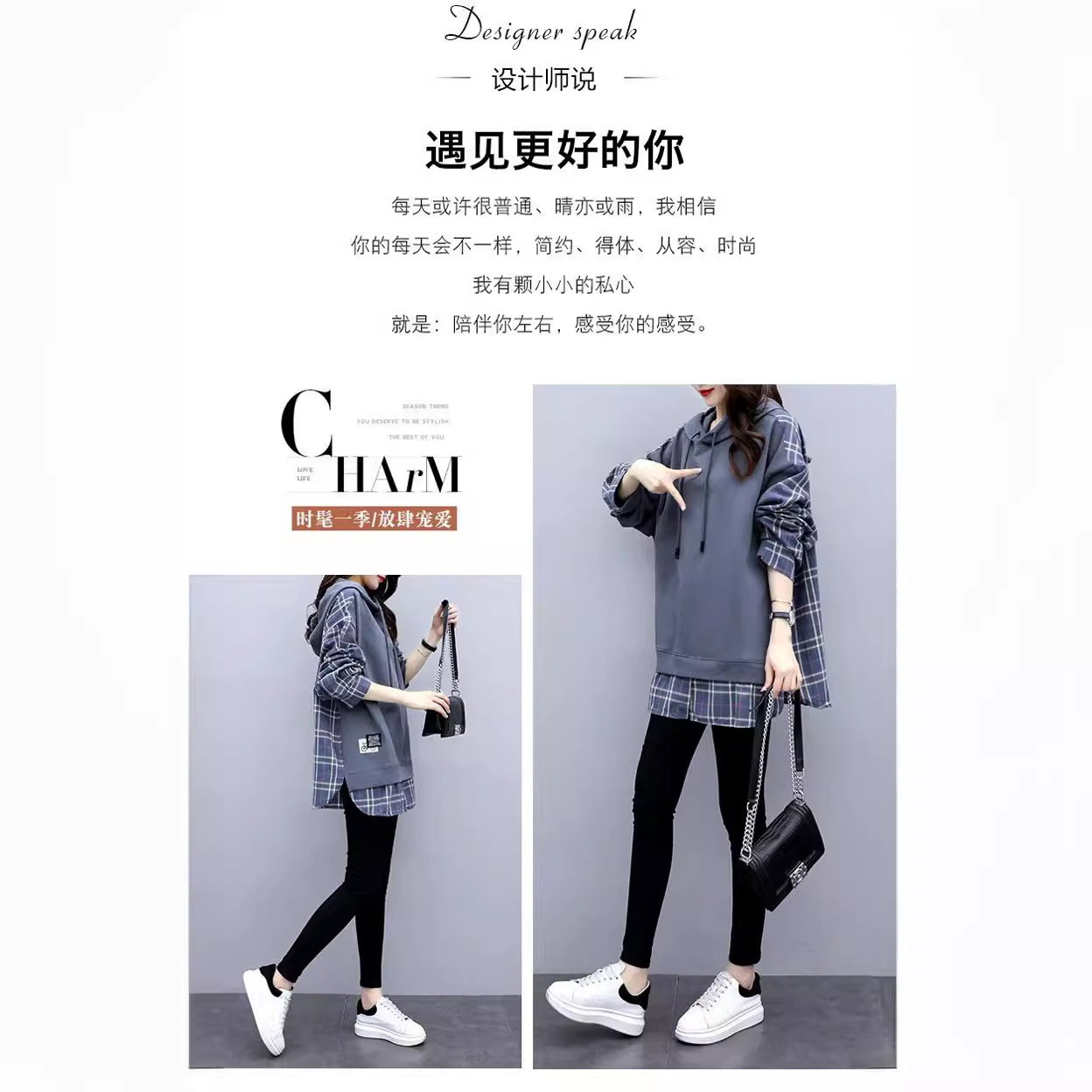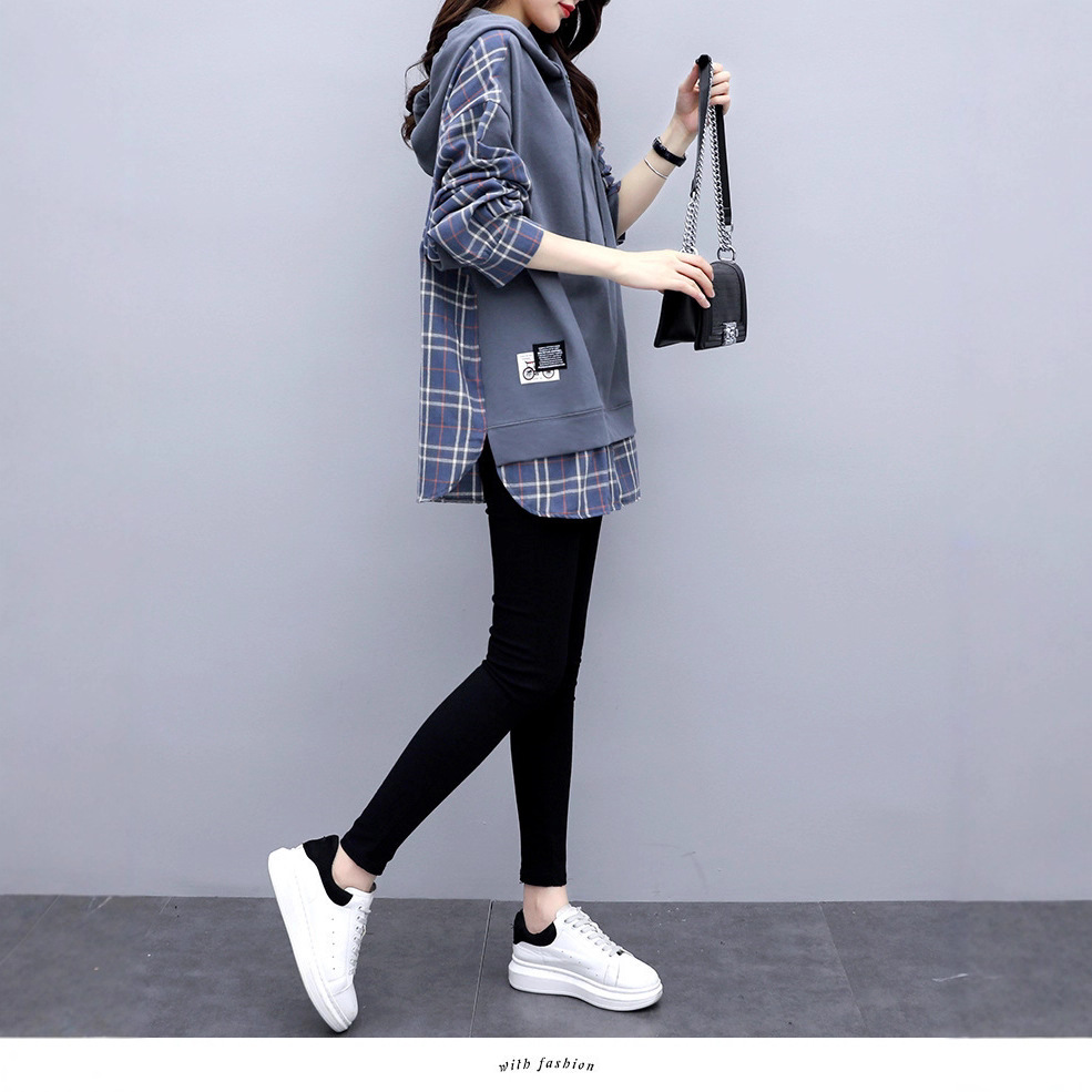 6535 хлопчатобумажный поддельный свитер из двух частей женский с капюшоном осенняя женская корейская версия свободного размера большой размер женская сшитая клетчатая куртка женский