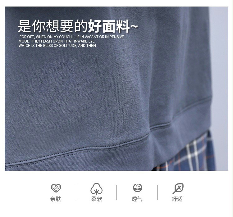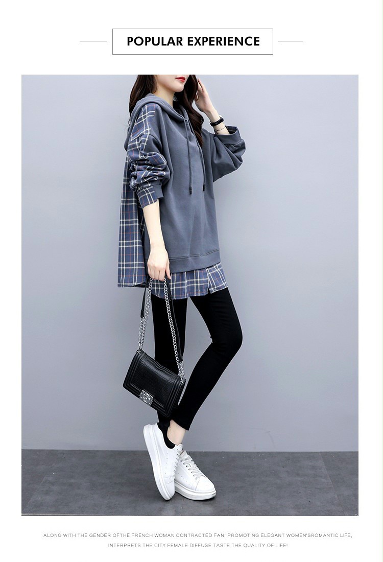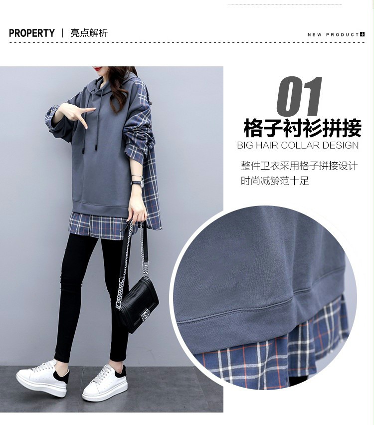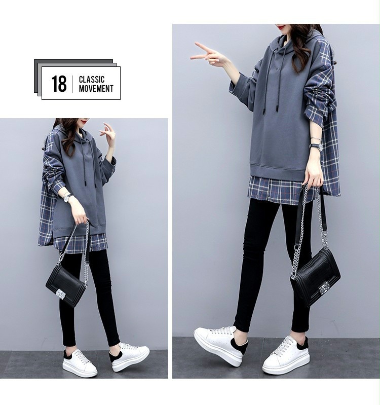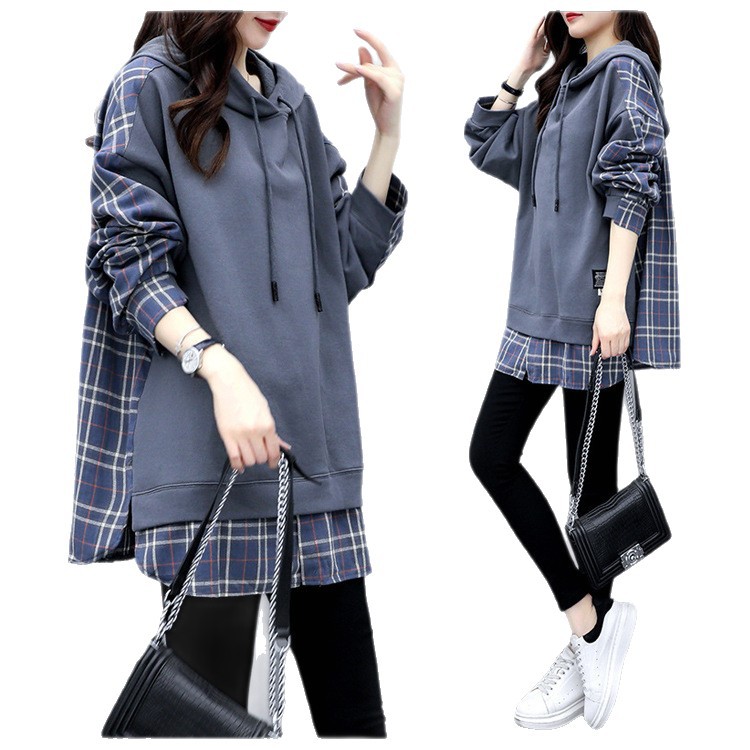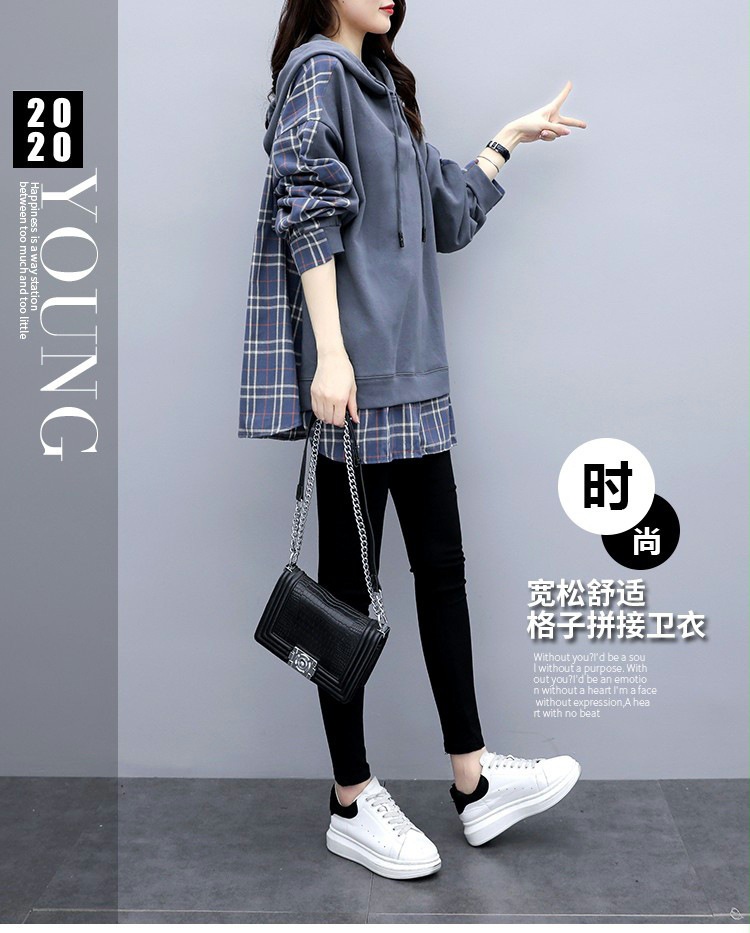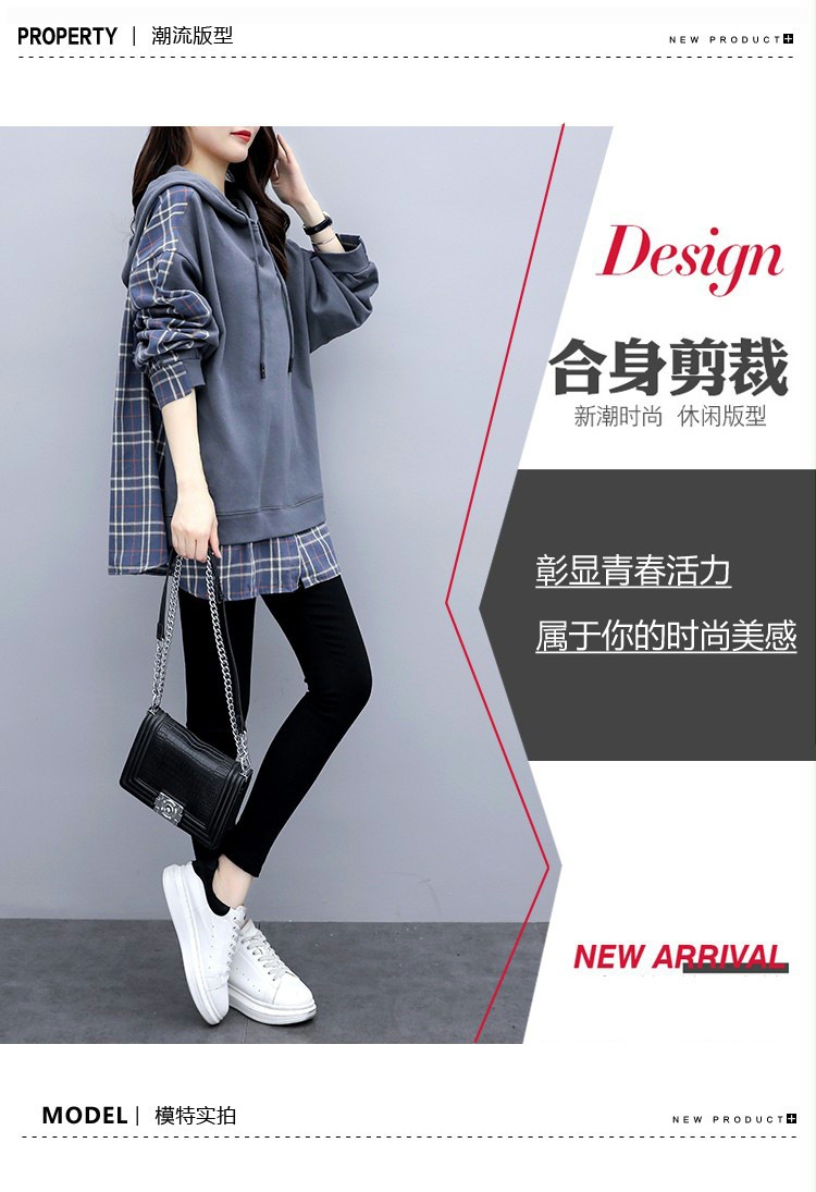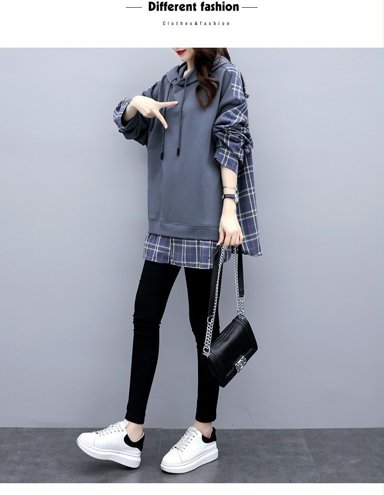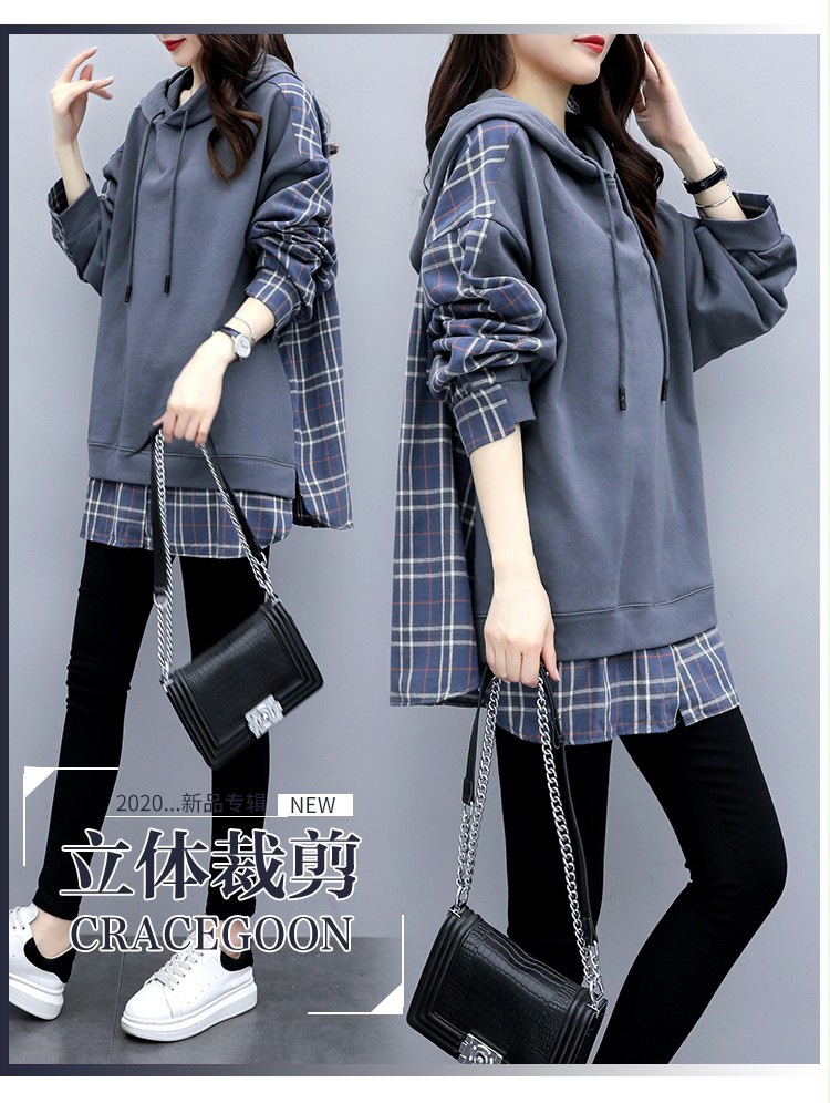 6535 хлопчатобумажный поддельный свитер из двух частей женский с капюшоном осенняя женская корейская версия свободного размера большой размер женская сшитая клетчатая куртка женский