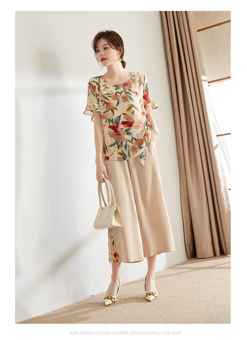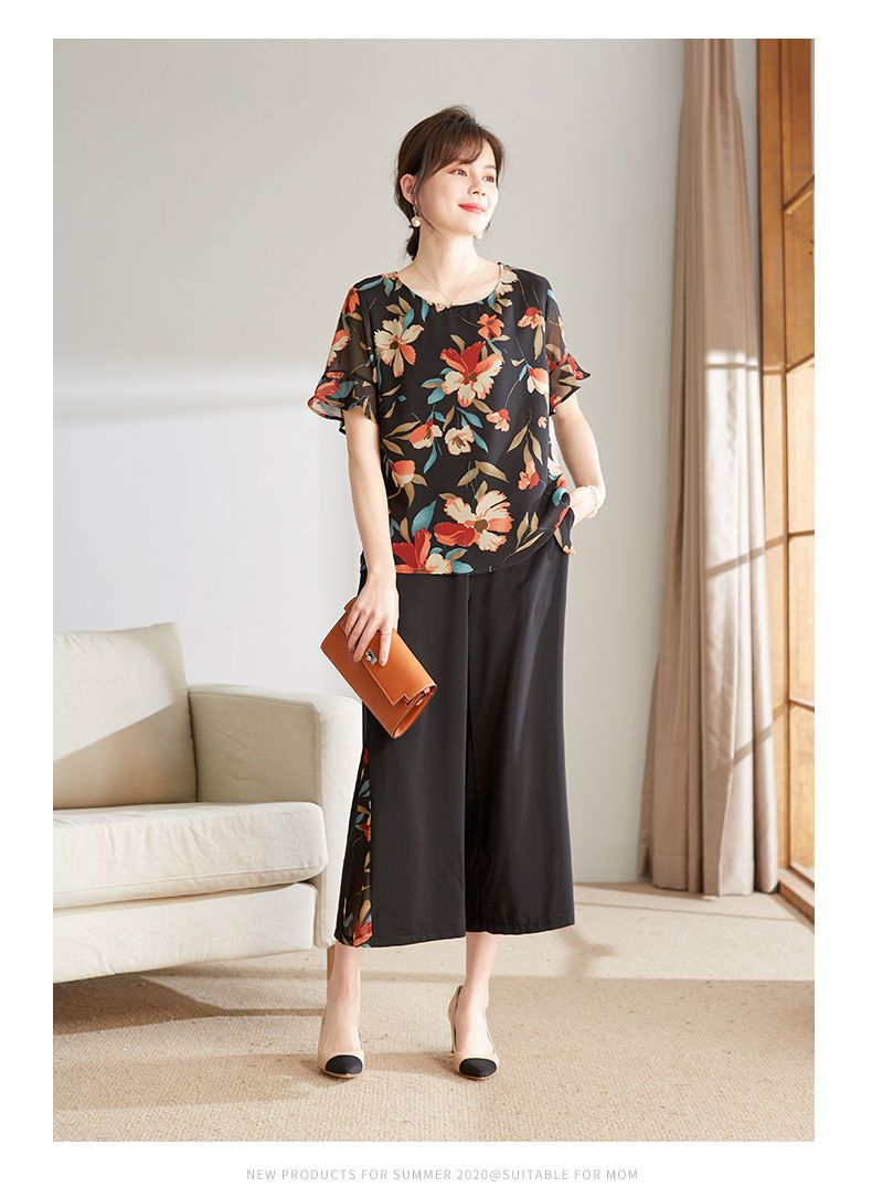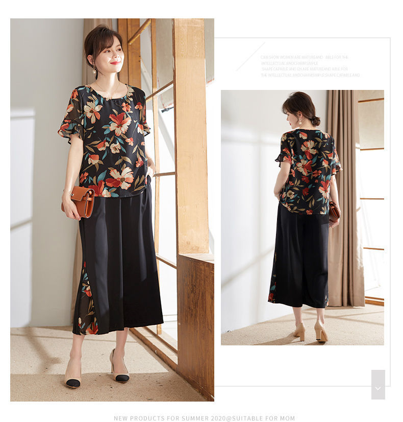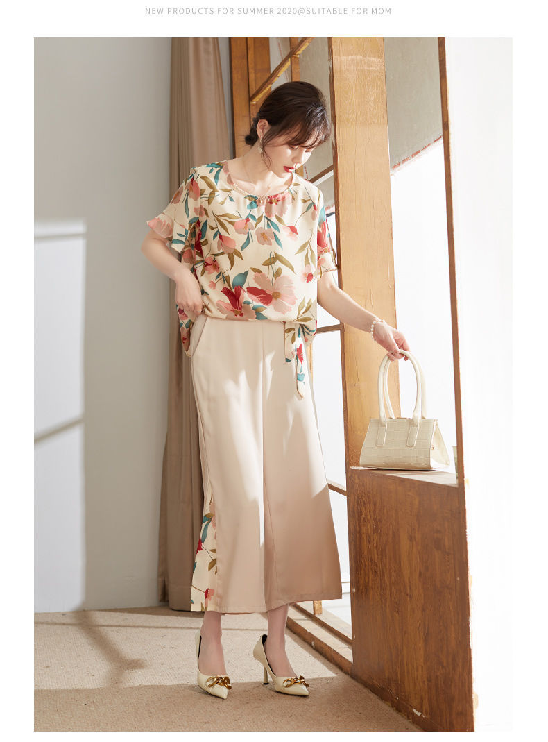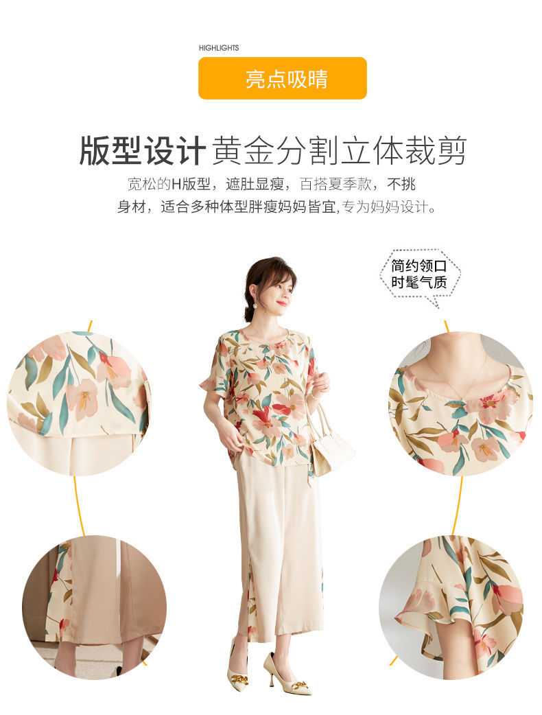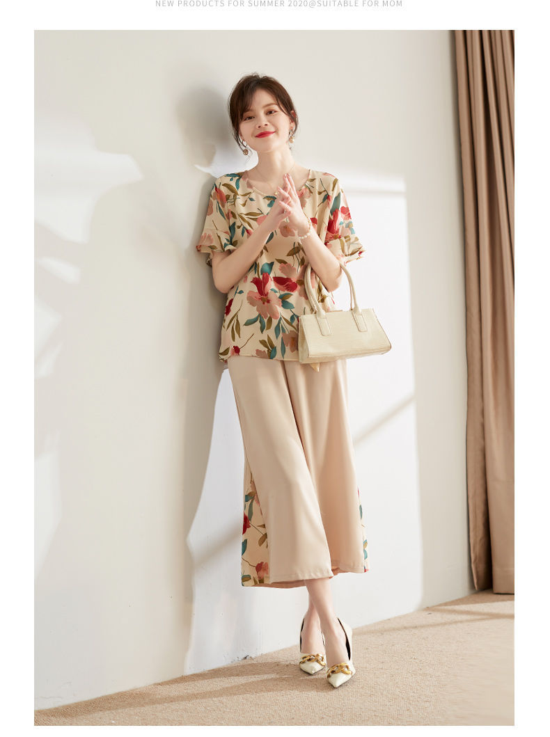 Одежда для мам. Новая летняя одежда 2025 года, стильный топ, рубашка с цветочным принтом с короткими рукавами, брючный костюм с широкими штанинами три четверти.