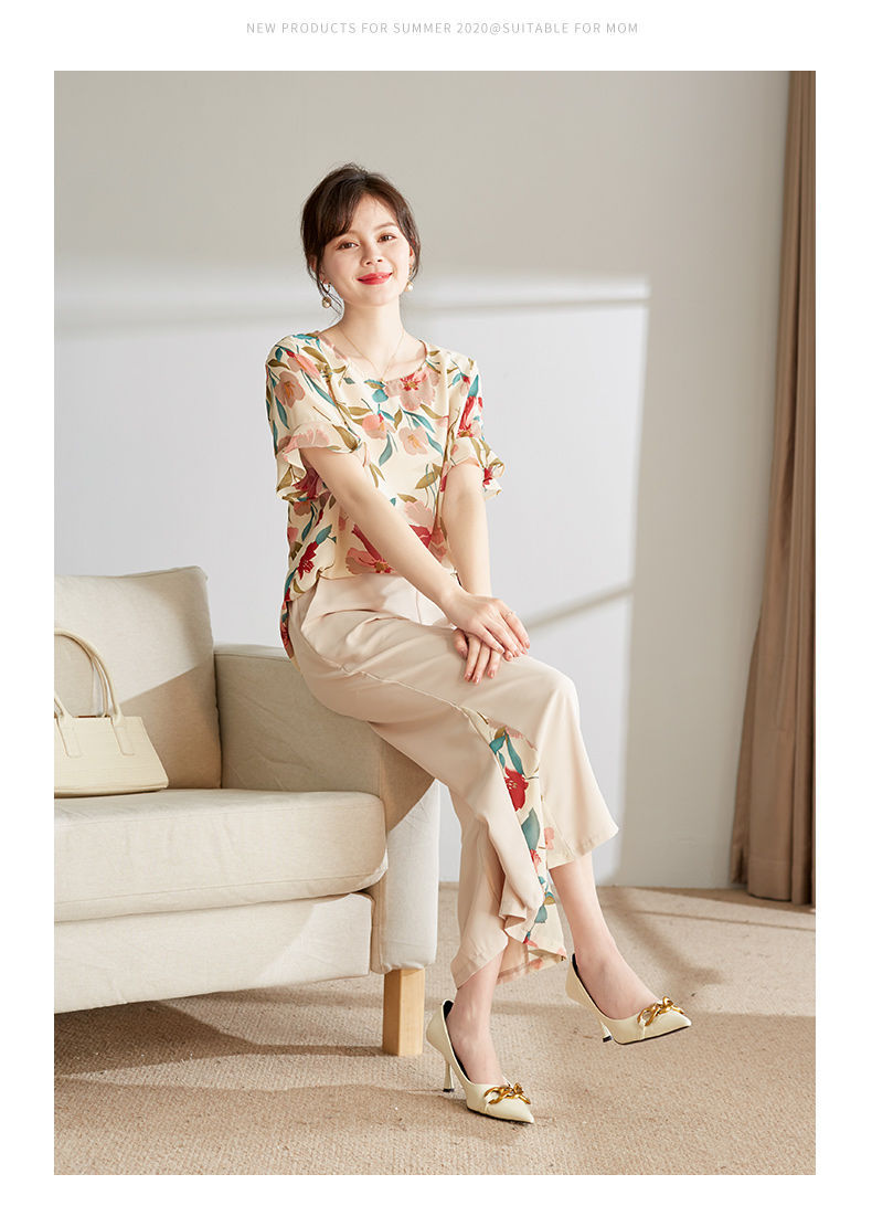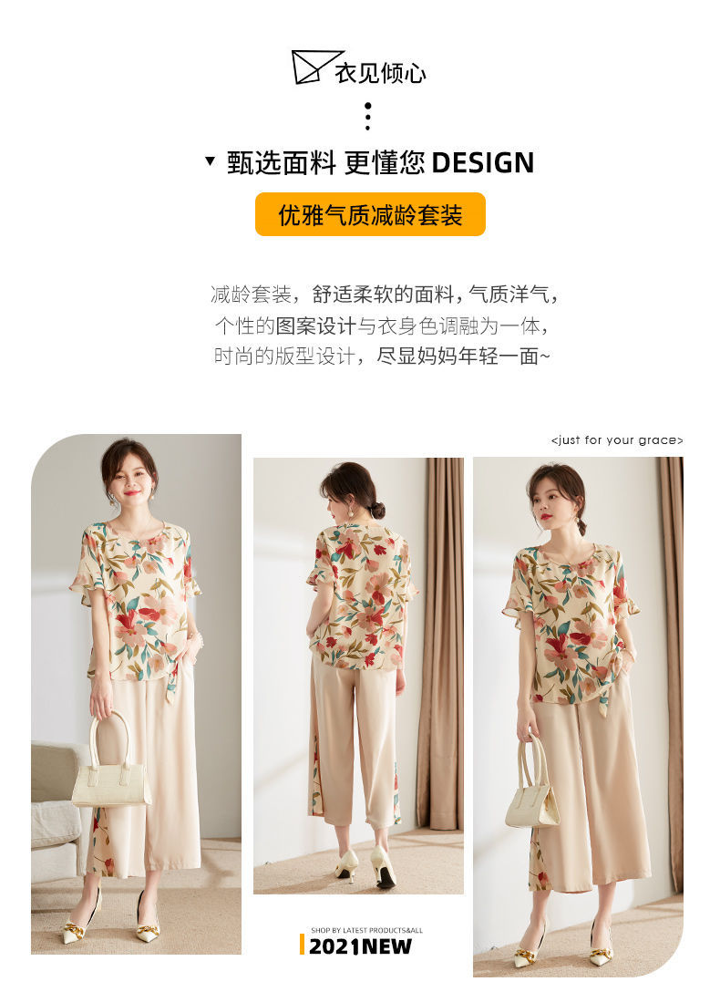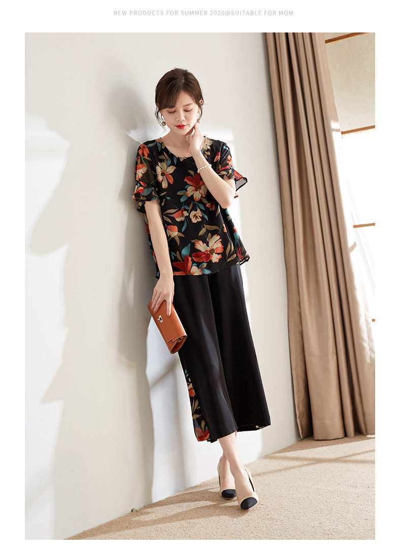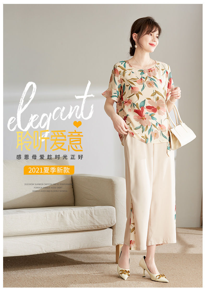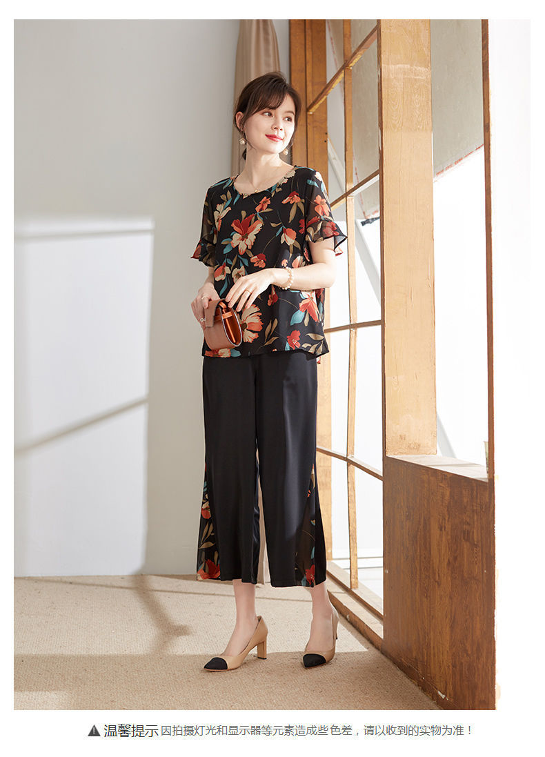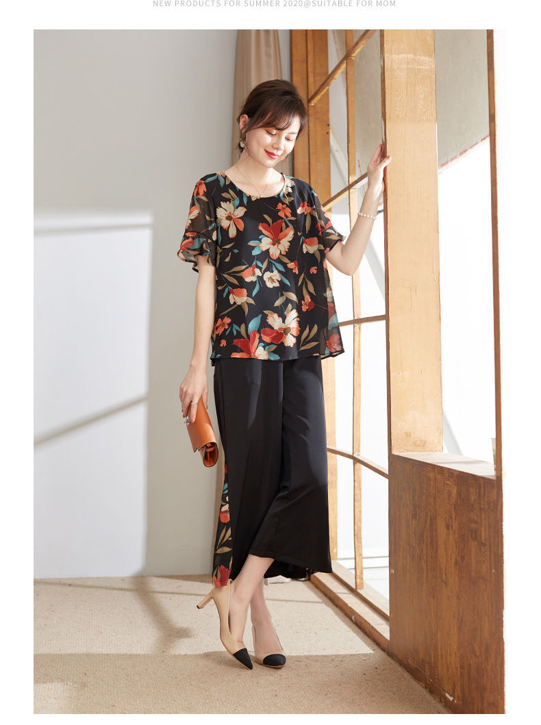 Одежда для мам. Новая летняя одежда 2025 года, стильный топ, рубашка с цветочным принтом с короткими рукавами, брючный костюм с широкими штанинами три четверти.