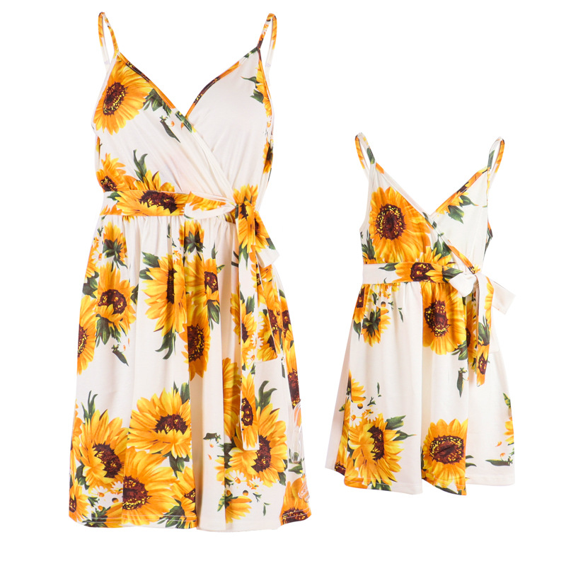 Весна и лето 2022 Европейское и американское новое облегающее платье принцессы с V-образным вырезом и принтом с поясом, платье для матери и платья, праздничный костюм для родителей и детей