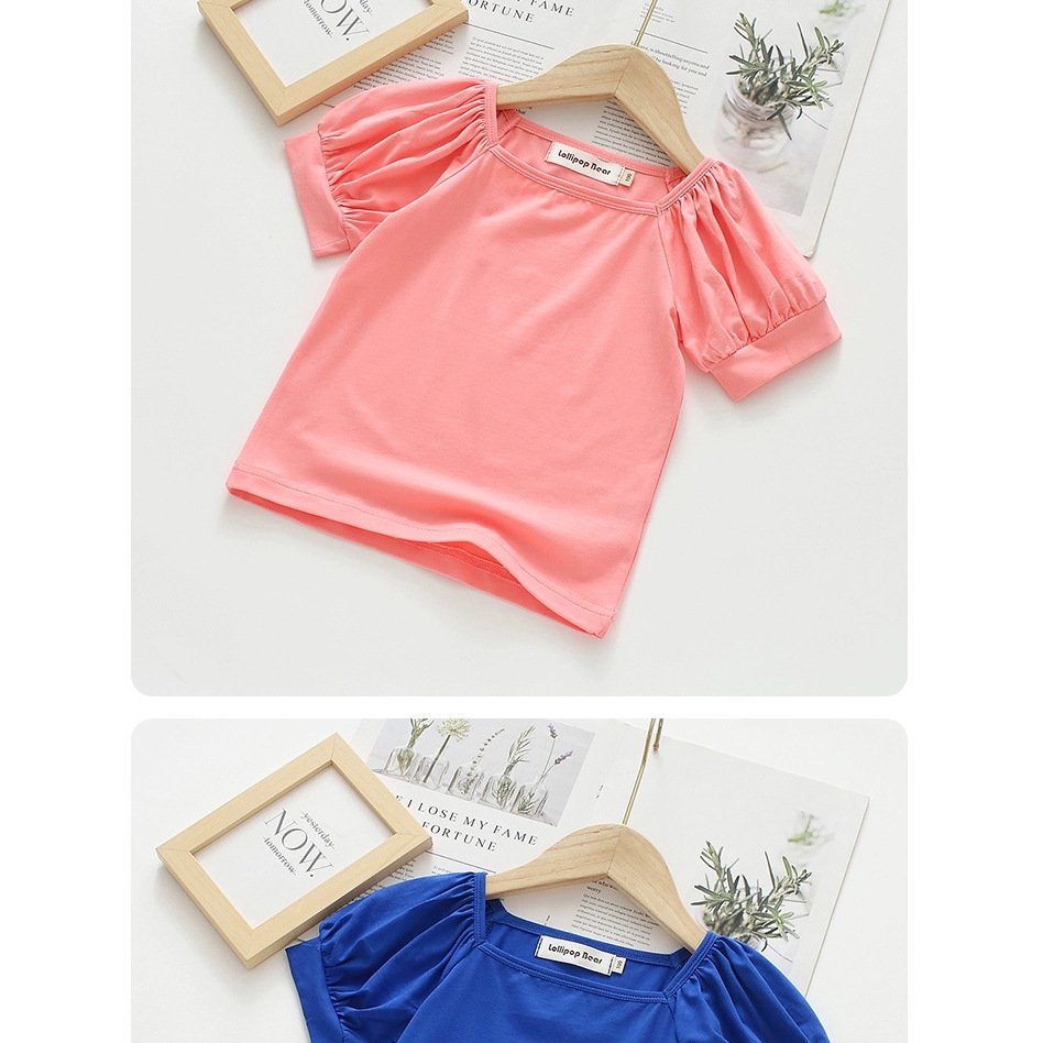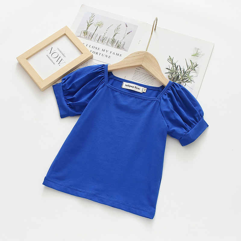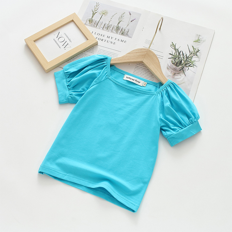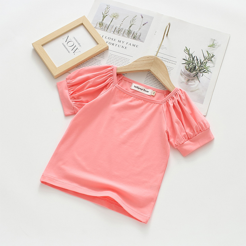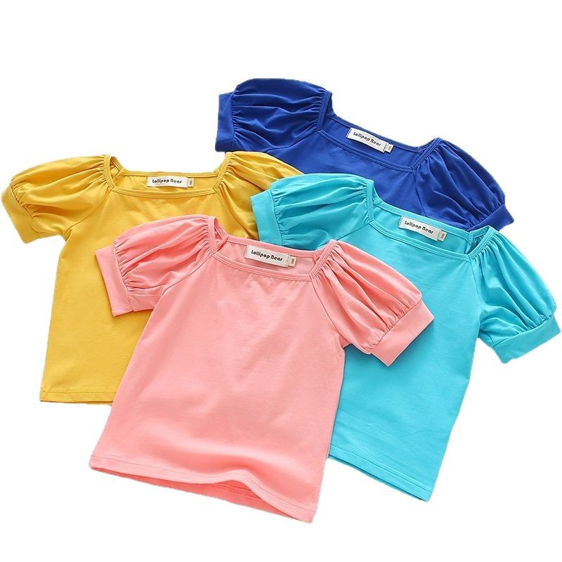 Летняя детская одежда 2025: Новая детская футболка из чистого хлопка с пышными рукавами, короткий рукав, однотонная, конфетных цветов, квадратный вырез, рукав до локтя, для девочек 2-6 лет