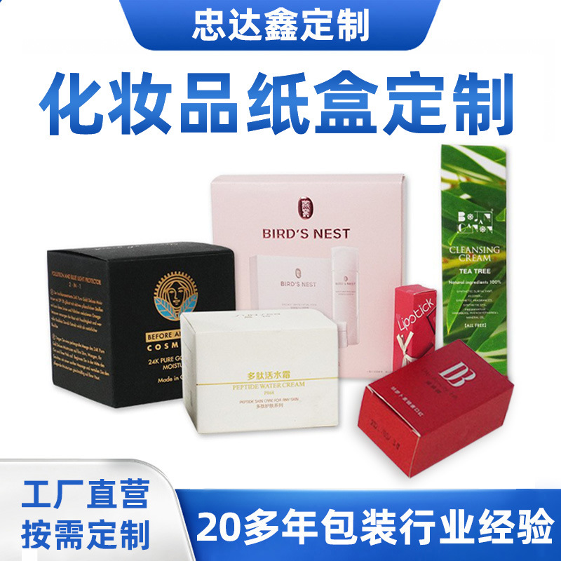 专业定制化妆品包装盒/口红盒,采用高档白卡纸材质,支持彩印+烫金工艺,双插盒折叠设计防尘抗压,适用于口红、眼影等美妆产品零售与礼品套装,提供LOGO定制+小批量起订服务,厂家直供品质保障。