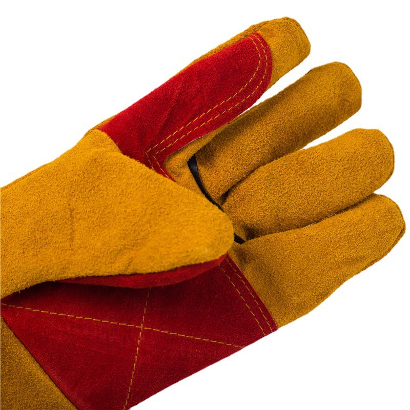 普通的手工焊手套所谓手工焊,就是我们平时常见的一把钳子夹住焊条的这种焊接。这类焊高温飞溅物多。所以用的手套多为加里的双层。长度也在34CM以上。