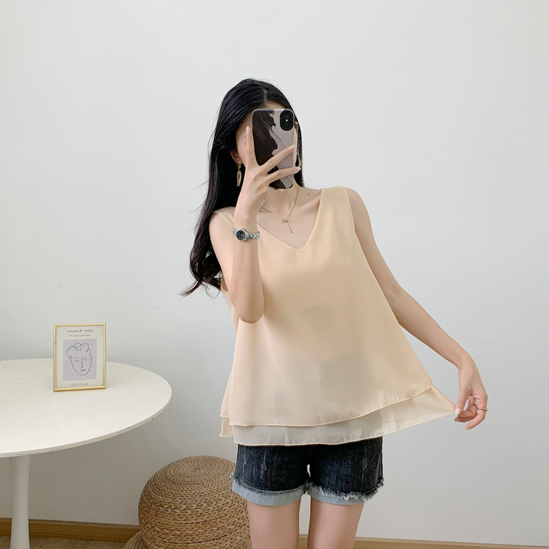 2023 женская шифоновая рубашка больших размеров в Корейском стиле, однотонный жилет с V-образным вырезом, средней длины, свободный живот, покрывающий поддельный шифоновый жилет из двух частей
