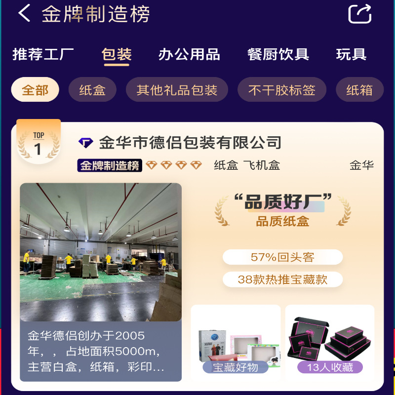 金华市德侣包装有限公司20年超级源头工厂 专业生产纸箱 白盒 礼盒 礼品盒 月饼盒 粽子盒 年货礼盒 白卡纸盒 瓦楞纸盒 牛皮纸盒 飞机盒 跨境产品包装盒工厂 48小时发货 定制快至72小时 免费设计 高品质包装 位于浙江省金华市金东区孝顺镇 满意度 百分之95以上的专业小批量 大批量都可以承接的生产工厂 可以开增值税发票 增值税普票 电话18967411313 许经理 金华市德侣新材料科技有限公司