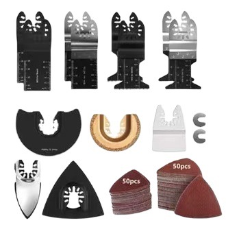 2*34mm 细齿高碳钢锯片 2*34mm 双金属锯片 2*45mm 粗齿高碳钢锯片 2*45mm 双金属锯片 1*88mm 高速卖半圆锯片 1*64mm 硬质合金半圆打磨切割片 1*70*52mm 不锈钢刮刀(铲刀) 2* U型垫圈 1*80mm 三角形砂纸打磨盘。 50* 80mm 三角形砂纸 (60-80-120-180-240#各10片) 1*手指砂纸垫 50*手指砂纸(60-80-120-180-240#各10片)