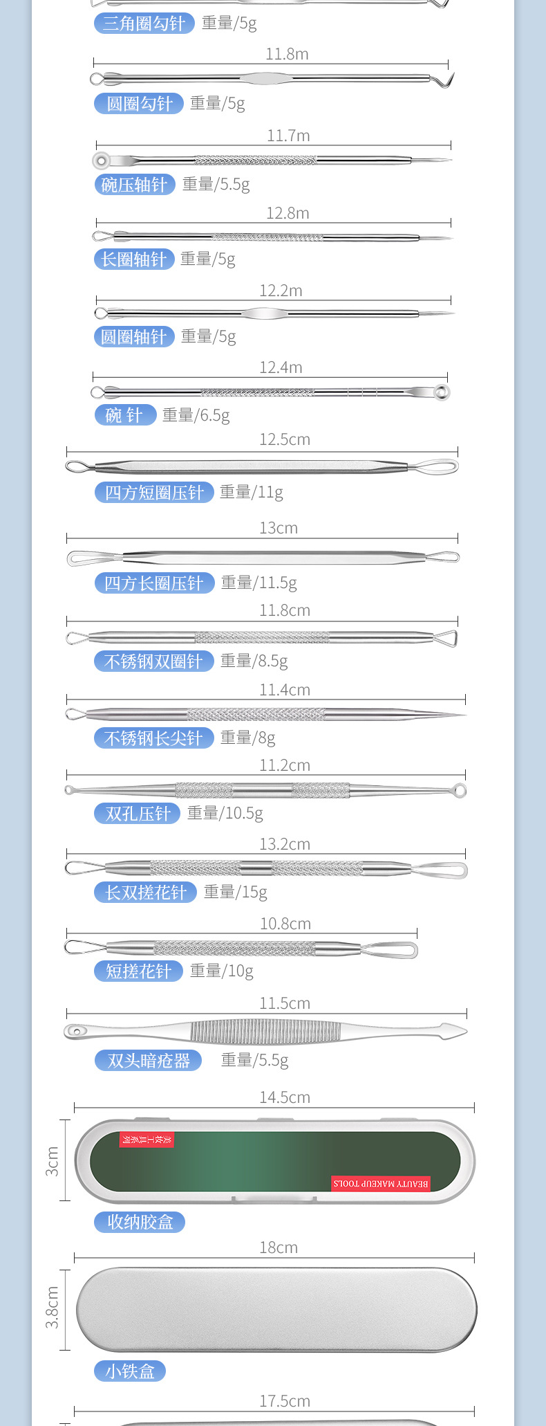 A-зажим для прыщей с изгибом (полное качество); B-Наклонный зажим для прыщей (полное качество); C-Зажим от прыщей с острым ртом (полное качество проверки); D-Четырехсторонняя игла с коротким кругом; E-Четырехсторонняя игла; F-длинная двойная игла; G модель-короткая двойная игла; H модель-игла с двумя отверстиями; I-Нержавеющая сталь с двойным кольцом; J-двухголовый прыщи; K-Треугольная игла; L-гальваническая игла; M-длинная штифта; N-гальваническая игла вала; O-чаша с финальной иглой; P-иглы для чаши; Q модель-гальваническая длинная игла; R-гальваническая длинная стальная игла; S-Розовая золотая длинная стальная игла; T-Нержавеющая сталь длинная заостренная игла; Серебряный штифт; Серебряный штифт; Гальваника из золота; Гальваника из золота; Сверхзаостренная игла из нержавеющей стали · Эллипс; Сверхзаостренная игла из нержавеющей стали · Треугольник; Зажим для прыщей из нержавеющей стали 5 штук; Набор игл прыщей из 4 частей (железные иглы); Обычные 4 иглы (стальные иглы); Профессиональный 4-контактный (стальная игла); Зажим крючка обычный 4-контактный (в резиновой коробке); Наклонный зажим обычный 4-контактный (в резиновой коробке); Прямой зажим обычный 4-контактный (в резиновой коробке); Набор игл от прыщей 8 комплектов (железная коробка); Набор игл прыщей 9 комплектов (железная коробка); 3 зажима прыщей (пластиковая коробка/полное качество проверки); Набор из 7 швов на молнии; Универсальный набор из 8 швов (железная коробка)