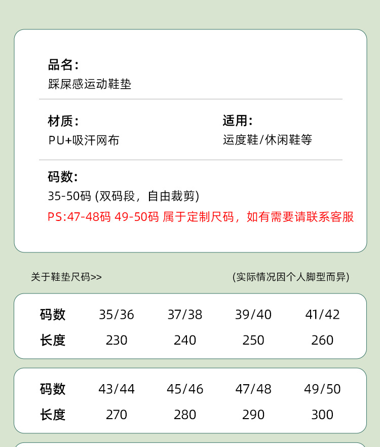 35-36; 37-38; 39-40; 41-42; 43-44; 45-46; 47-48 (индивидуальный размер, необходимо связаться со службой поддержки клиентов); 49-50 (индивидуальный размер, необходимо связаться со службой поддержки клиентов); 230mm-280mm