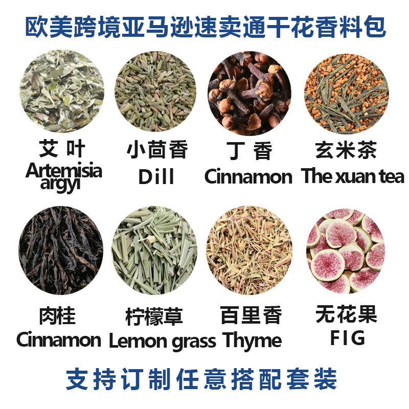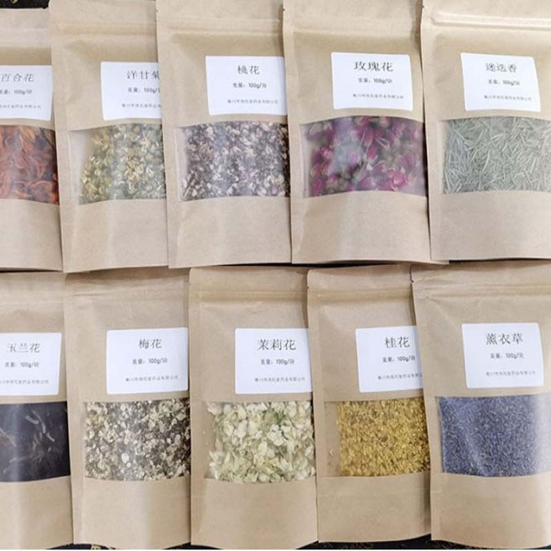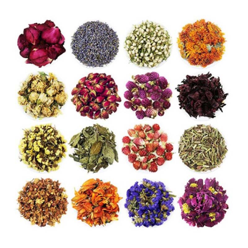 Розы; Хризантема плода; Лаванда; Голубая бабочка; Забудь-меня-не; Золотые лепестки шелковой хризантемы; Календула; Хуан Цзюй; Листья мяты; Розмарин; Лепестки роз; Тысяча дней красный; Цветок персика; Цветок пиона; Лимонная трава; Тимьян; Рис; Гвоздика; Жасмин; Чернила красная роза; Лили; Анис; Корица; Хунцяомэй; Фолий Артемиба; Лавровый лист; Шалфей; Магнолия; Красочные хризантемы; Чай из листьев лотоса; Китайская роза; Цветок момордики большой; Фиолетовый; Одуванчик