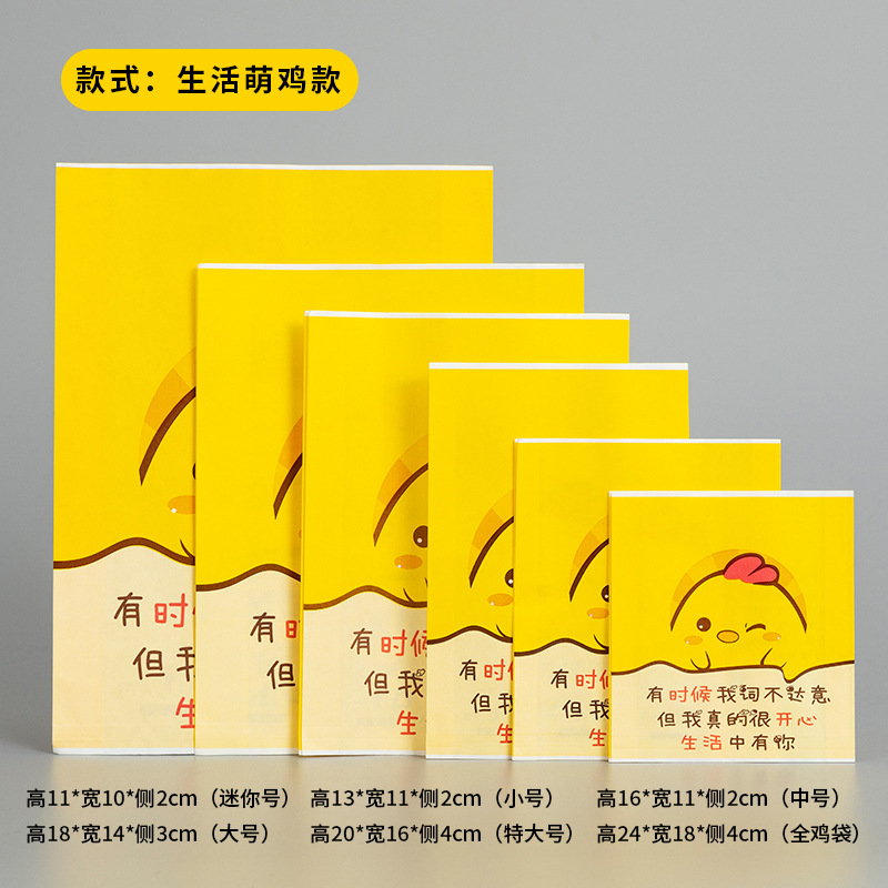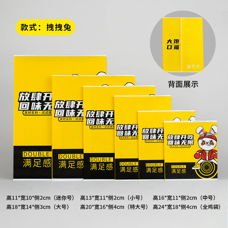 Высота 11*Ширина 10*Боковая часть 2 см (мини-размер); Высота 13*Ширина 11*Боковая часть 2см (маленький размер); Высота 16*Ширина 11*Боковая часть 2см (средний размер); Высота 18*Ширина 14*Боковая часть 3см (большой размер); Высота 20*Ширина 16*Боковая часть 4 см (очень большой размер); Высота 24*Ширина 18*Боковая часть 4 см (полный мешок с курицей)