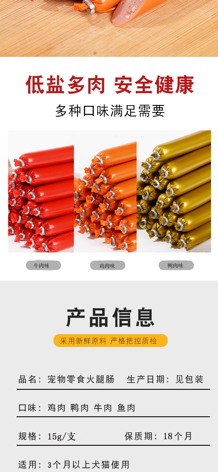 产品规格:15g/支,口味:鸡肉味,牛肉味,鱼肉味,鸭肉味,猫犬通用,批量大货装箱规格为:10kg/箱,20kg/箱。25kg/箱。大批量进货买家可以协商快运或者物理包邮事情,具体联系买家。支持装袋贴牌,代加工,代发货等业务。