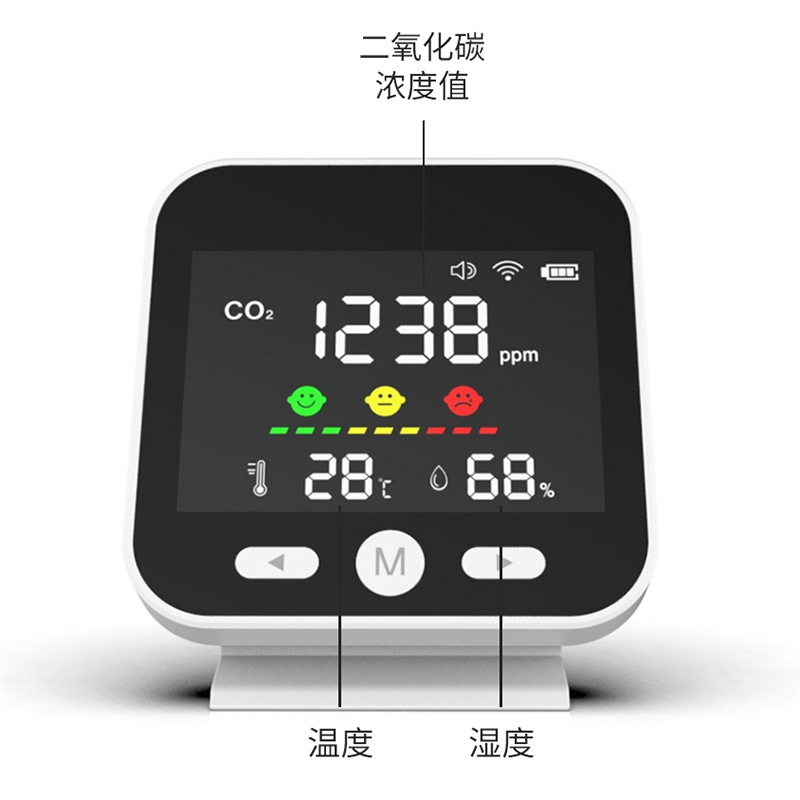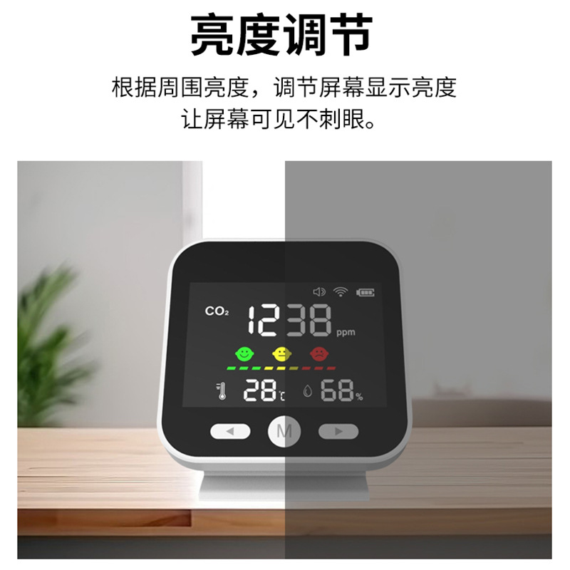 dioxide (CO2) with temperature, and humidity on its display.It is with the 3-color emoji symbols, which visualizes the CO2 air quality. if the CO2 concentration reaches the(set)all-alarm value, then the monitor will trigger a danger alarm.In addition,It not only measures datas in real time, but also supports intelligent connection through Tuya WiFi, After connecting your phone, you can view real-time data anytime and anywhere.
