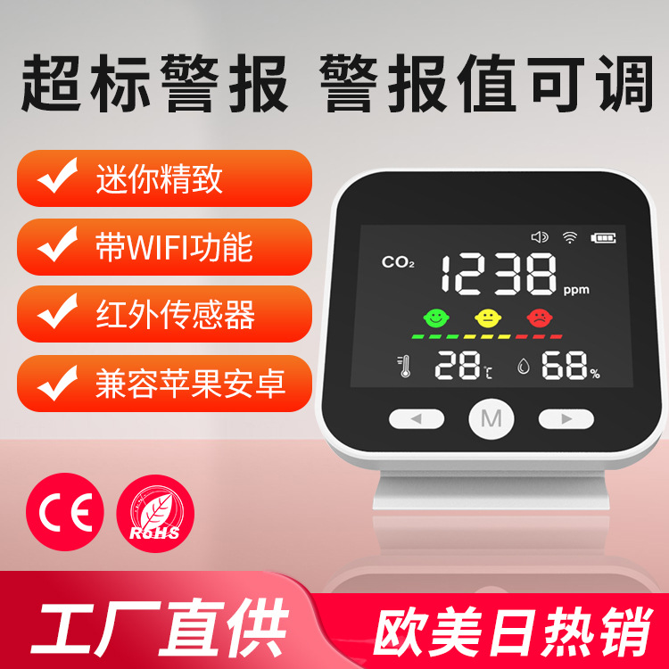 本产品是一款检测碳的4合一二氧化碳测量仪,它结合了红外(NDIR)传感器实时监测碳在其显示器上显示二氧化碳(CO2)、温度和湿度。它带有三种颜色的表情符号,可视化二氧化碳空气质量。如果CO2浓度达到(设定)所有报警值,则监视器将触发危险报警。此外,它不仅实时测量数据,而且支持通过涂鸦WiFi进行智能连接,连接手机后,您可以随时查看实时数据。