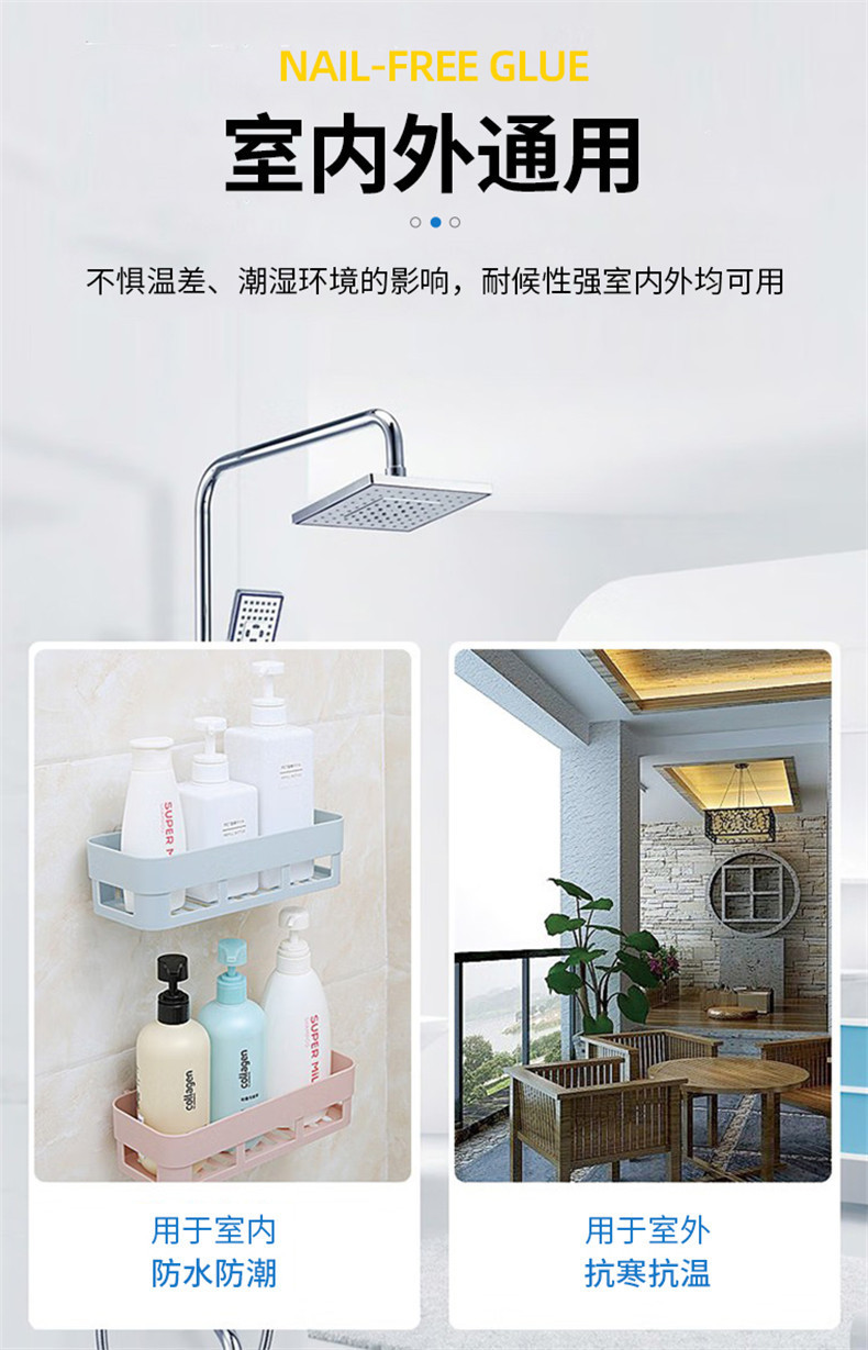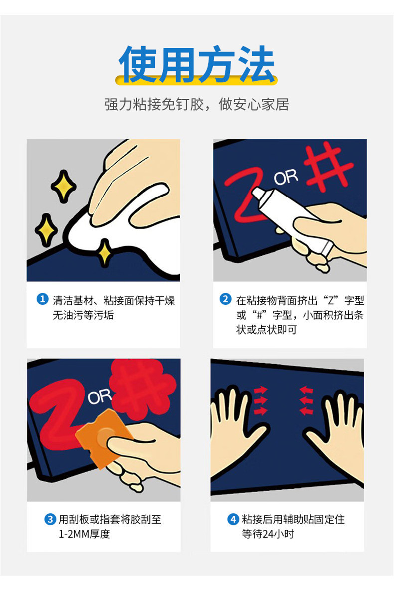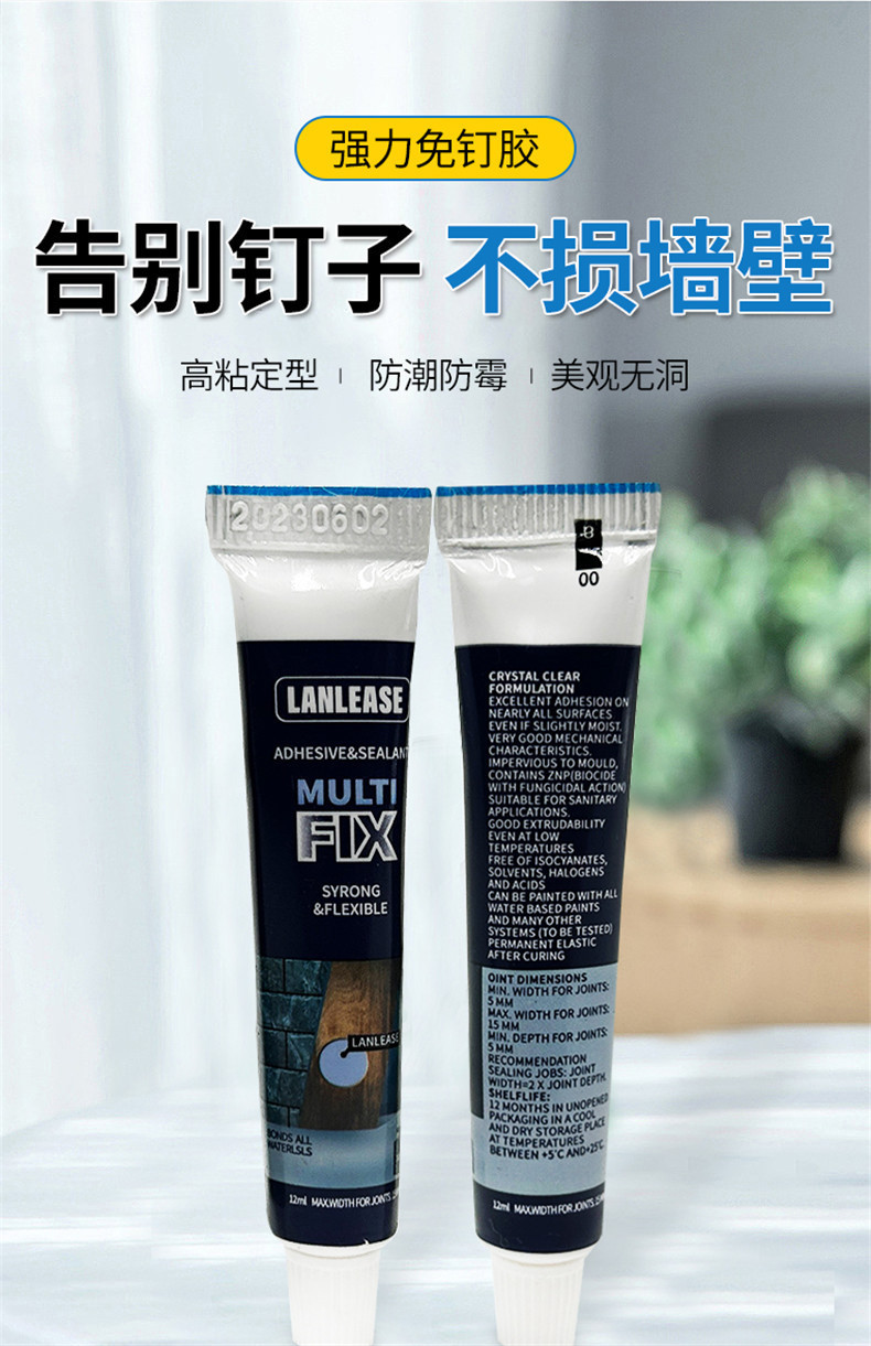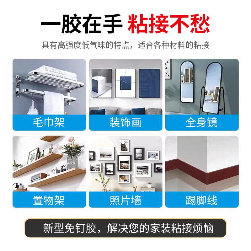 Заменяет гвозди, не повреждает стену, сильная адгезия, быстрое позиционирование, водонепроницаемость, проницаемость, можно работать под водой, устойчивость к плесени, без запаха, без формальдегида, хорошая устойчивость к атмосферным воздействиям.
