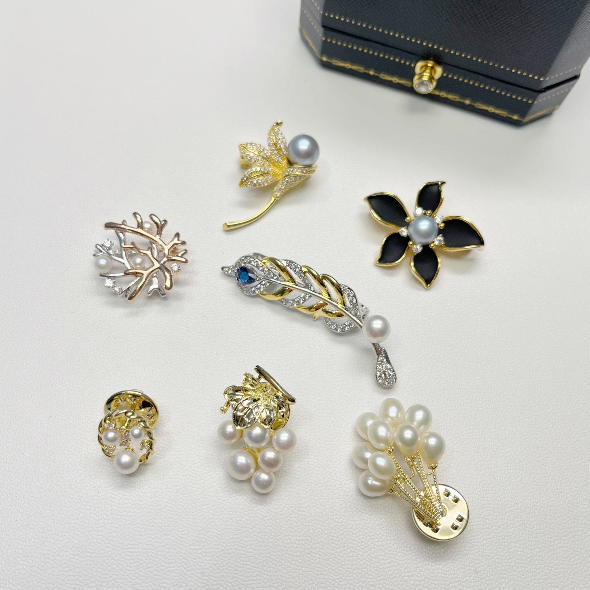 Брошь с перьями - пресноводный пучок на пару, жемчуг; Виноградные шпоры, игла для лошади, пресноводная булочка на пару, жемчуг; Брошь «Маленький черный цветок» — пресноводный круглый жемчуг; Игла для воздушной шары-желчатый пресноводный рис в форме жемчуга; Маленькая игла с полой прямозубой, жемчуг в виде пресноводных булочек на пару.; Двухцветная деревянная брошь-песноводный пучок, приготовленный на пару жемчугом.; Маленькая брошь из кленового листа – пресноводный круглый жемчуг.