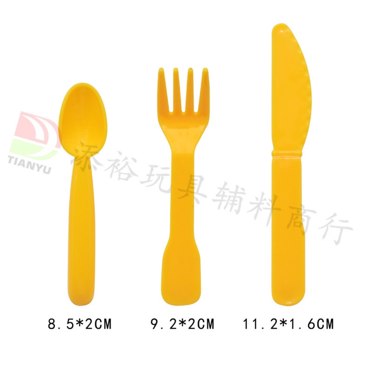 Новый игрушечный нож для игрового домика, вилка и ложка, костюм из 3 предметов, желтый оранжевый серый телесный оптом