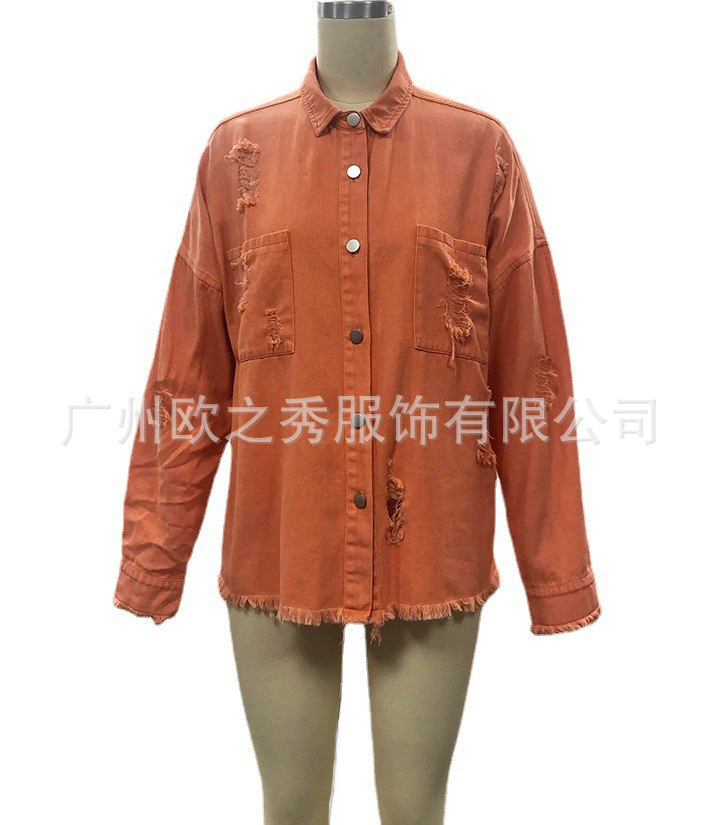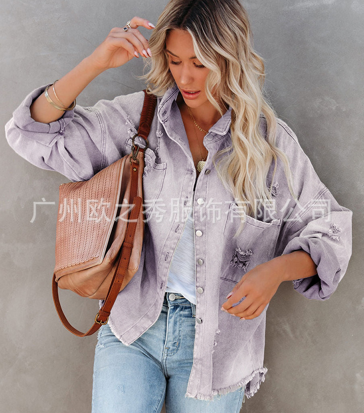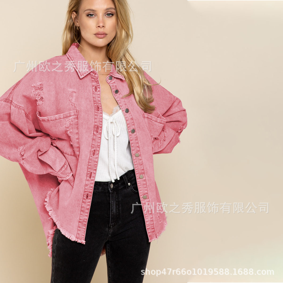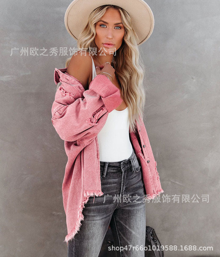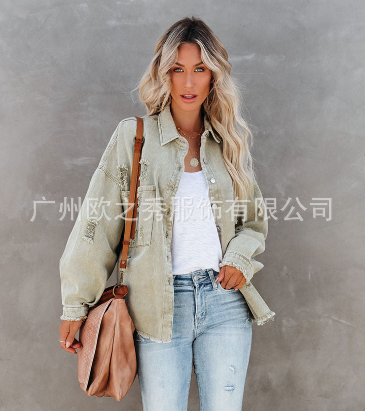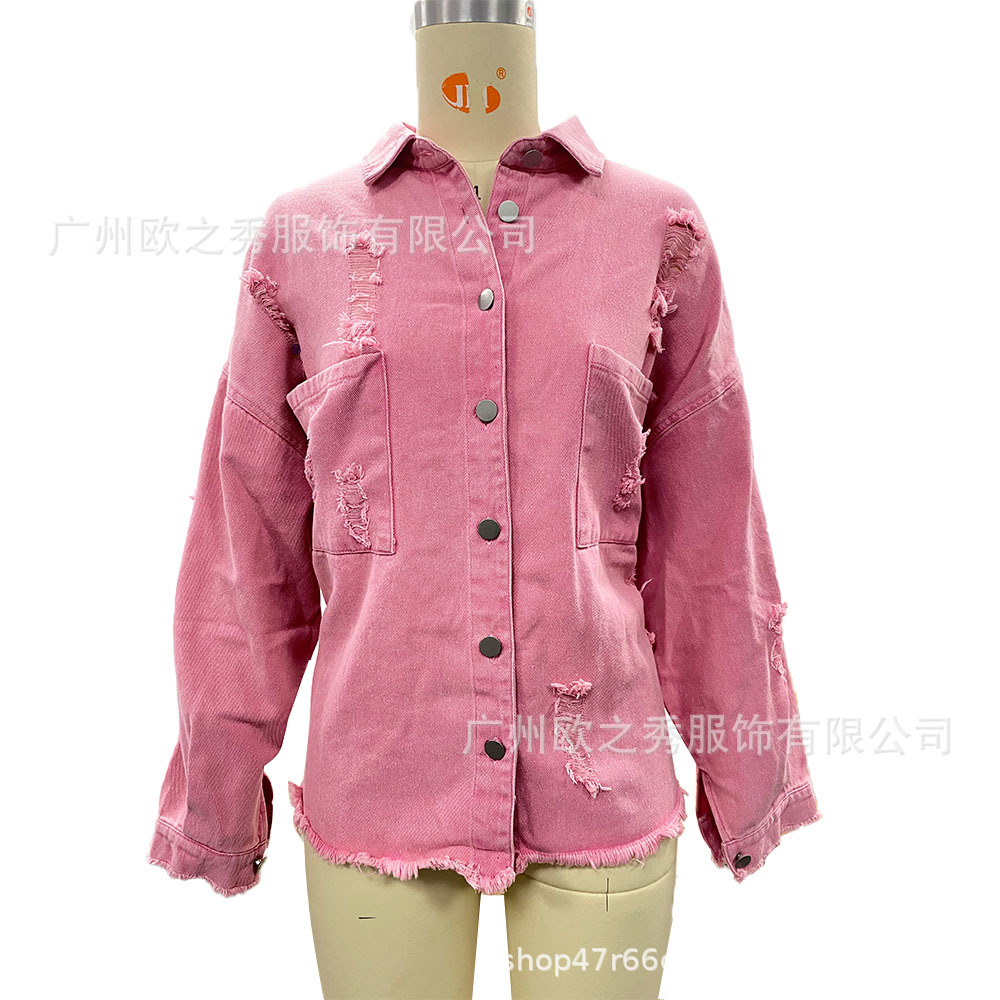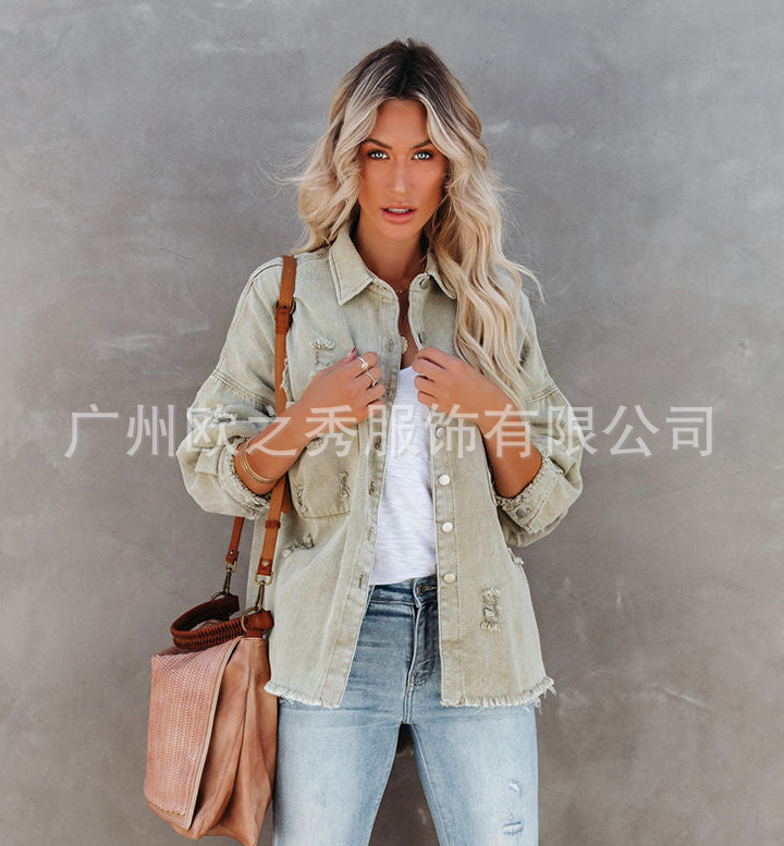 Amazon трансграничная джинсовая куртка средней длины в европейском и американском стиле с рваными краями для женщин, весенне-осенний топ с лацканами и длинными рукавами, новый стиль