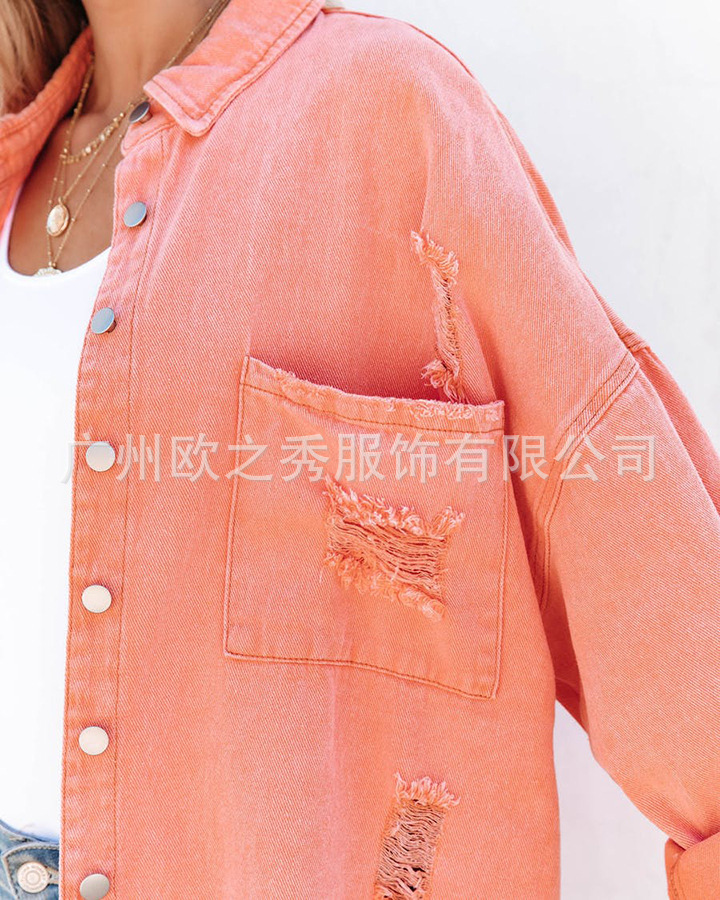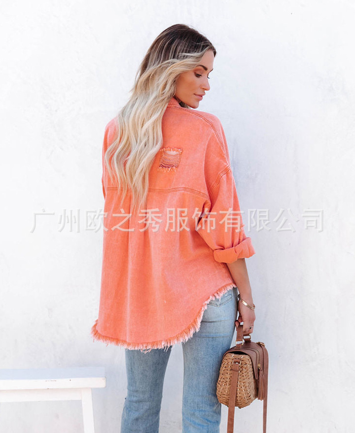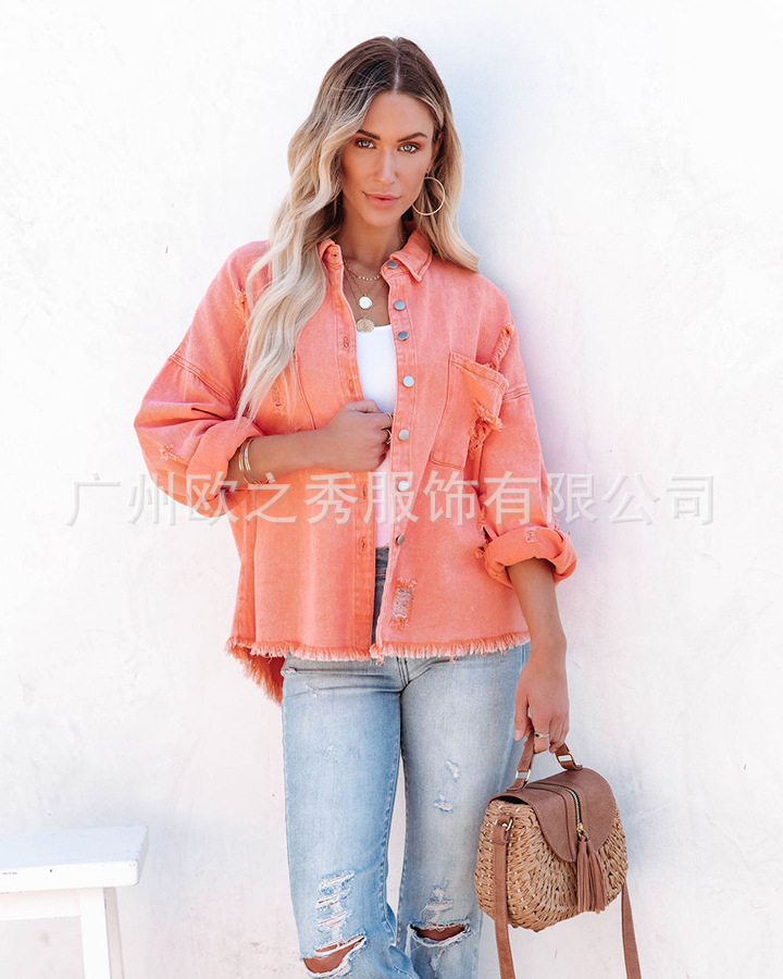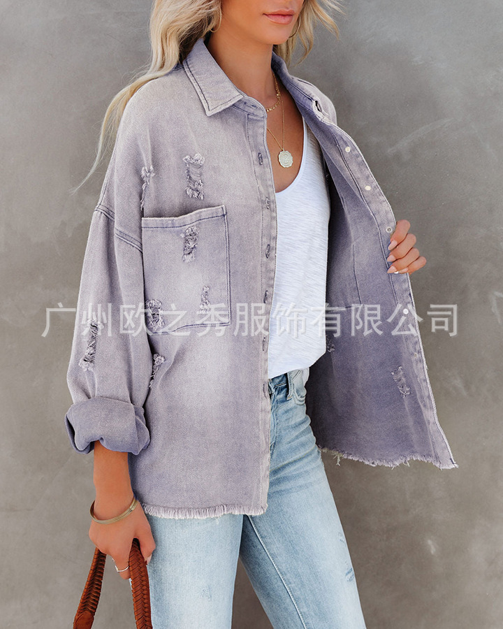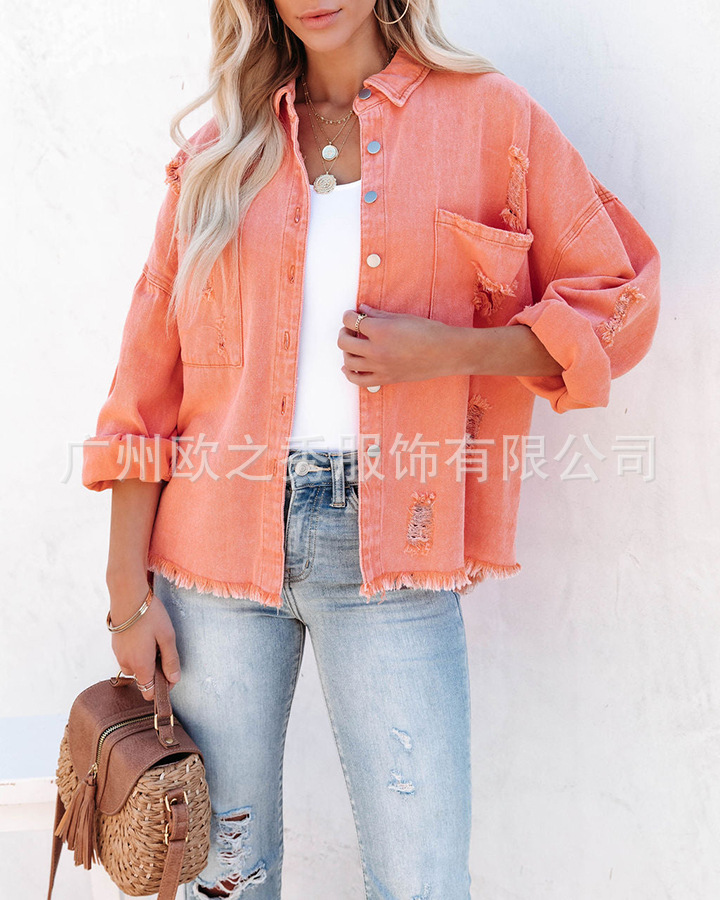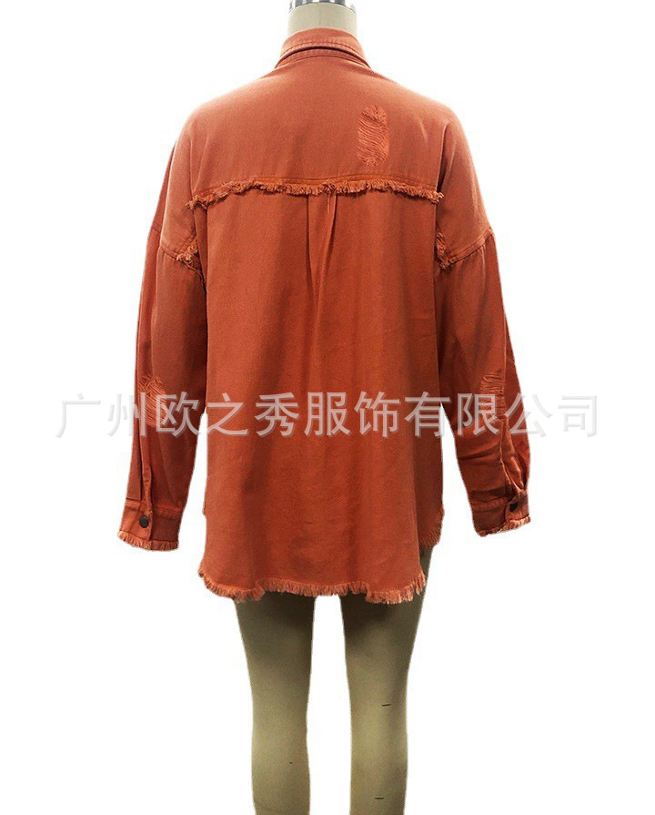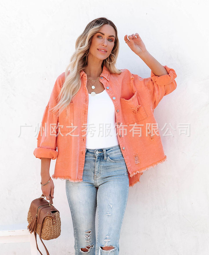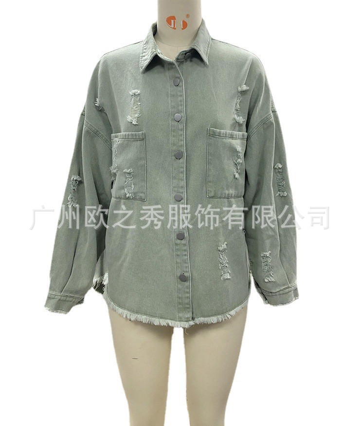 Amazon трансграничная джинсовая куртка средней длины в европейском и американском стиле с рваными краями для женщин, весенне-осенний топ с лацканами и длинными рукавами, новый стиль