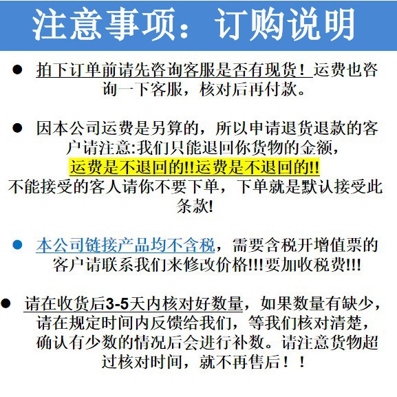 注意:申请退货退款时,货物已经寄出后(因已产生运费快递已扣款),支付的运费不给予退回,所以只能退回货款金额。不能接受的请勿下单!!