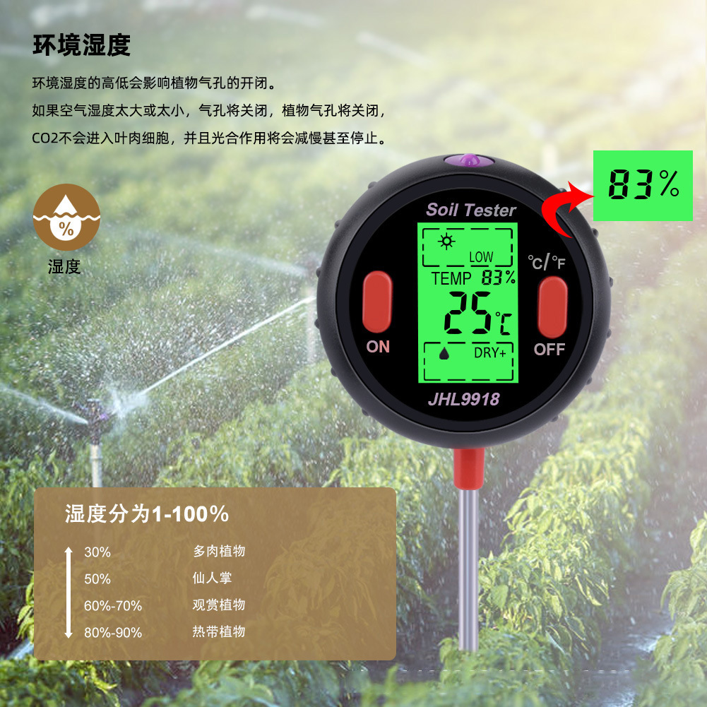 3.测量土壤温度范围: -9℃-50℃(16℉-122℉),精度:1℃/ 1℉