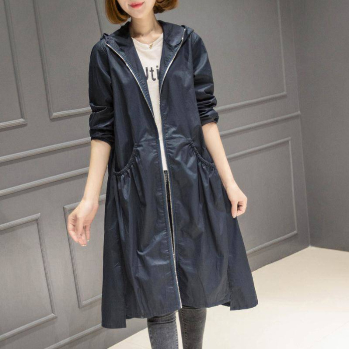 Весна и осень 202, новая корейская модная куртка с капюшоном, свободная тонкая однотонная ветровка средней длины выше колена для женщин