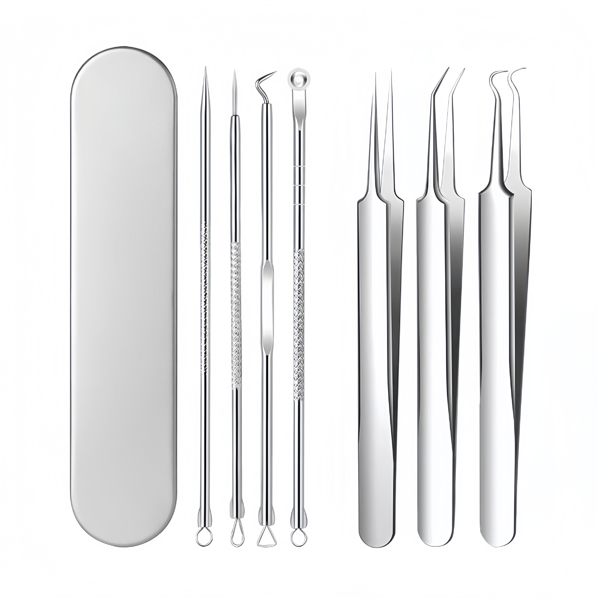 (Большой размер) Лупа с 5-кратным увеличением; (Маленький размер) Лупа с 5-кратным увеличением; (Маленький размер/9 см) Зажим для прыщей с прямым носиком; (Маленький размер/9 см) Зажим для прыщей с наклонным отверстием; (Маленький размер/9 см) Закругленный зажим для удаления акне; Набор из четырех игл для гальванического покрытия (в коробке); Зеркальный светильник с прямым отверстием и зажимом для удаления акне; Зеркальный свет, наклонный зажим для устранения прыщей; Зеркальный зажим для акне с изогнутым наконечником; Круг из 0.45kg голов; Круг из 1.05kg голов; Треугольная игла от прыщей с круглой головкой; Игла от прыщей с круглой головкой; Квадратный круг на обоих концах; Обычный прямой зажим №5.; №5 обычный косой зажим; Обычный зажим для гибки №5.; Суперострая прямая клипса №5.; Суперострая косая клипса №5.; Суперострый зажим для изгиба № 5.