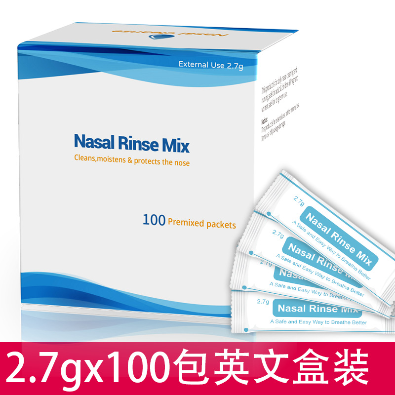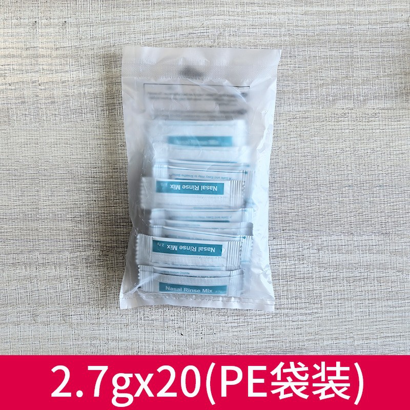英文2.7克/包,40包1盒装或1PE袋装,2.7克搭配300ML洗鼻器使用,调配0.9%浓度;