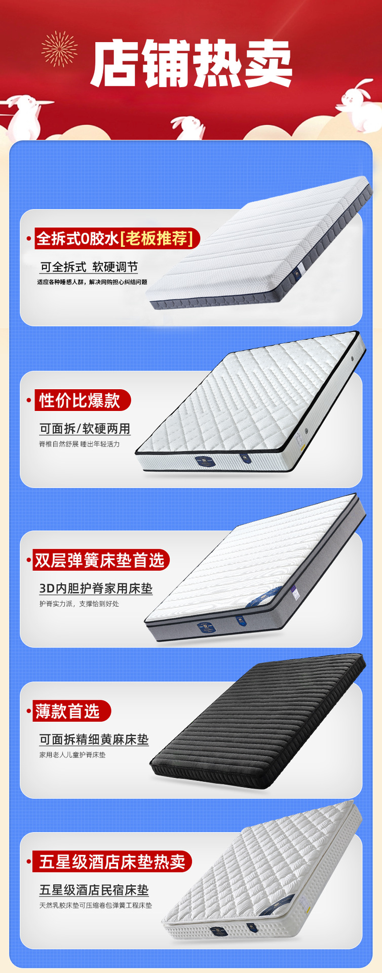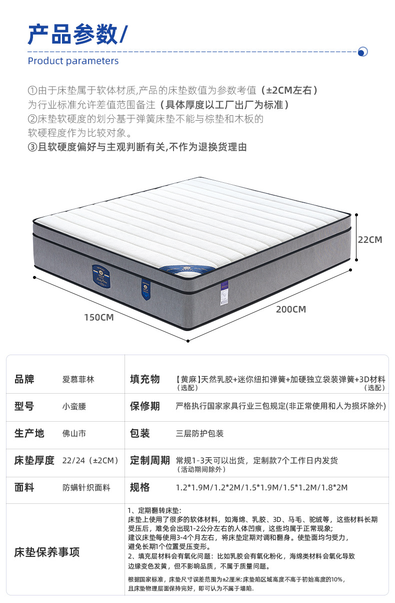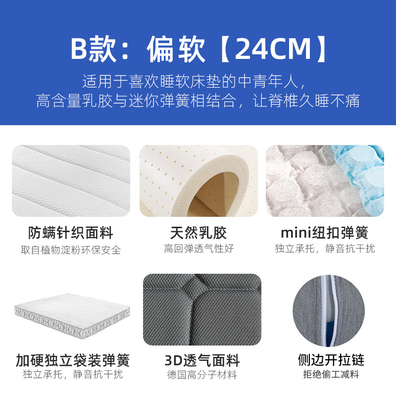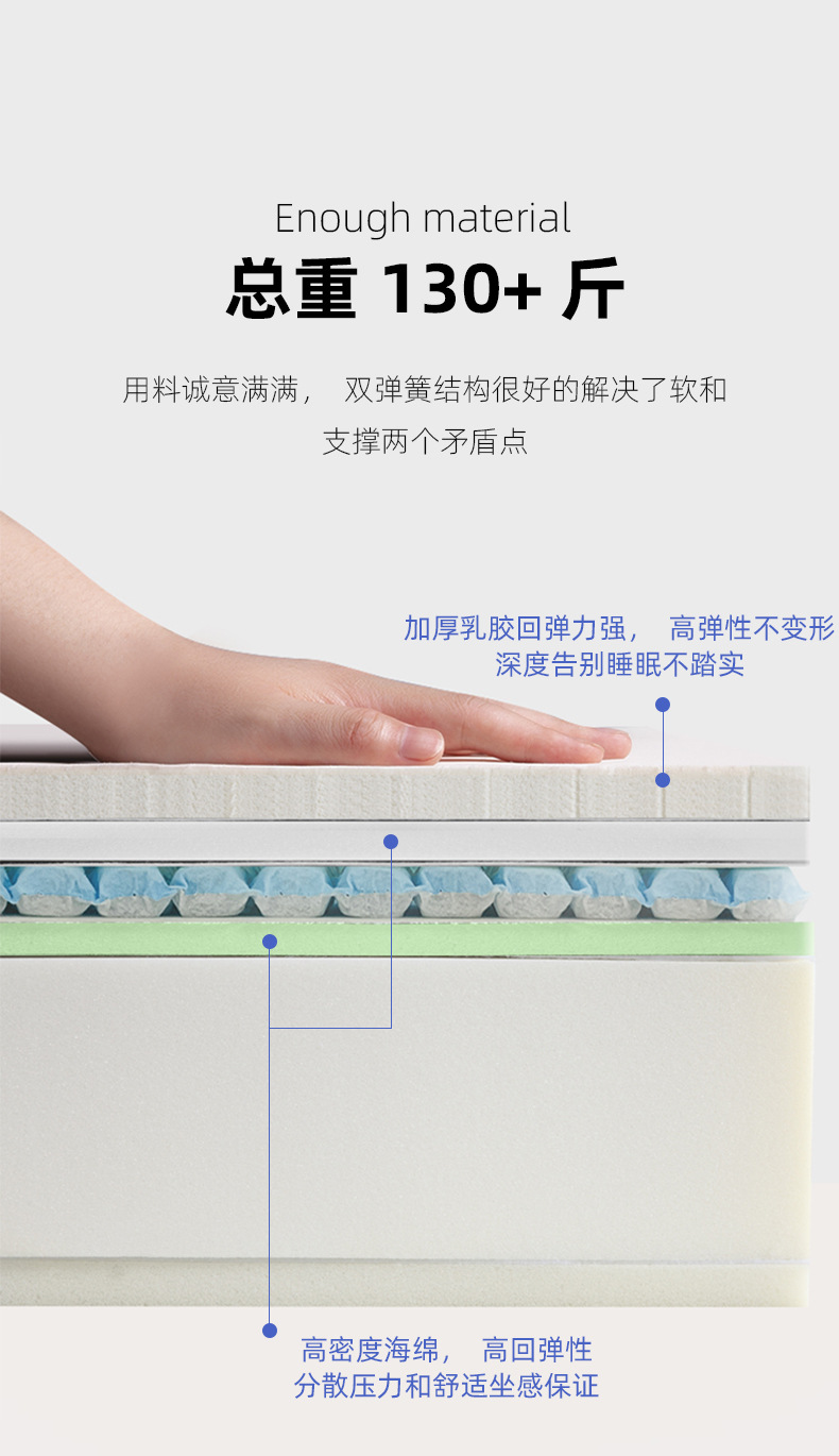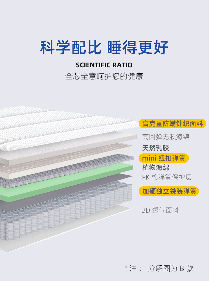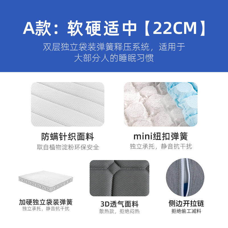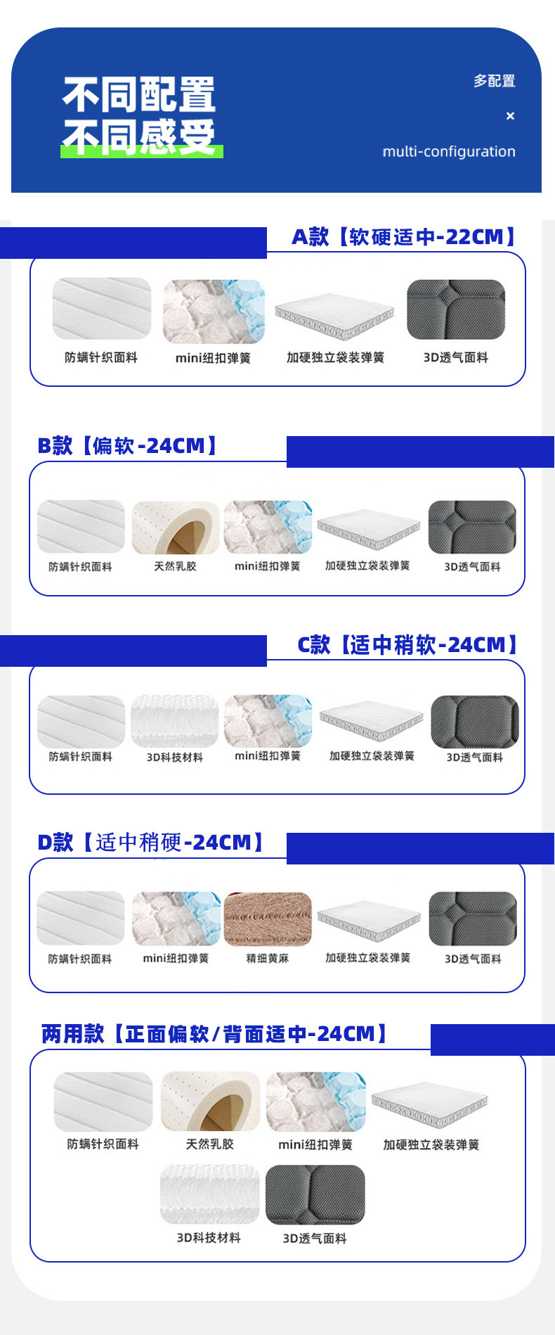 Тип A (22 см, умеренная твердость и мягкость): ткань против клещей + мини-пружина на пуговицах + закаленная независимая пружина сумки + 3D дышащая ткань; Тип B (24 см, ощущение мягкого сна): ткань против клещей + латекс 2 см + мини-пружина на пуговицах + закаленная независимая пружина сумки + 3D дышащая ткань; Тип C (24 см, умеренный и немного мягкий): ткань против клещей + материал 2 см3D + пружина с мини-кнопками + закаленная независимая пружина сумки + 3D дышащая ткань; Тип D (24 см, умеренный и слегка твердый): ткань против клещей + пружина с мини-ґудзиками + джут толщиной 2 см + закаленная независимая пружина сумки + 3D дышащая ткань; Модель двойного назначения 24 см: ткань против клещей + латекс 2 см + пружина мини-кнопок + закаленная независимая пружина сумки + 2 см3D-материал + 3D-дышащая ткань