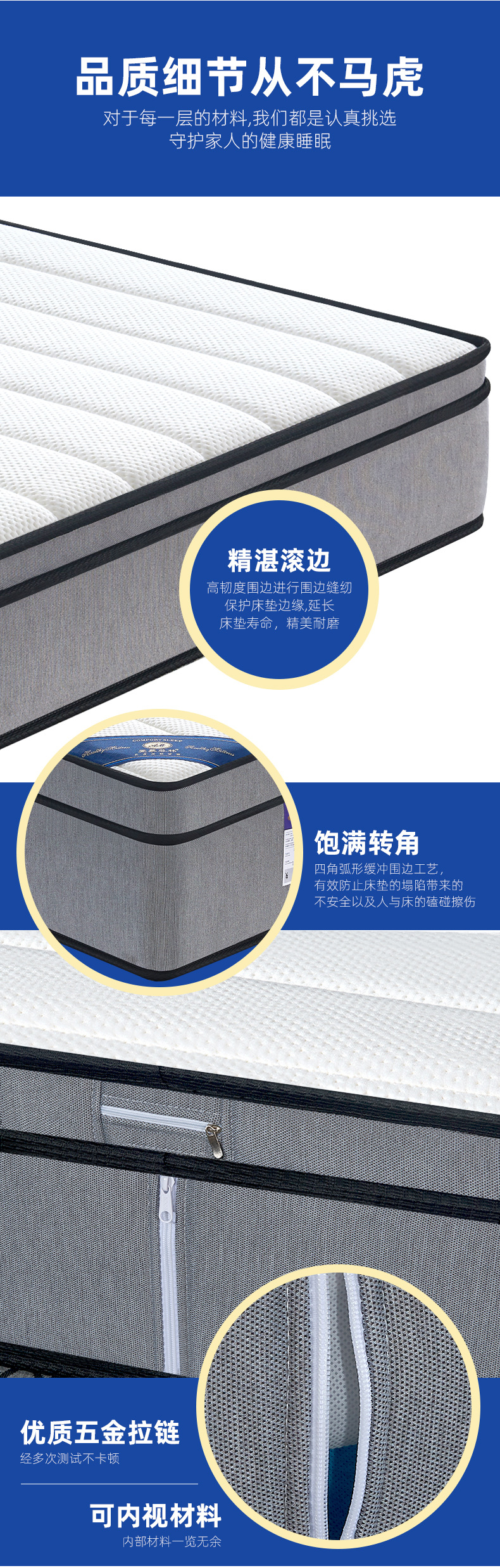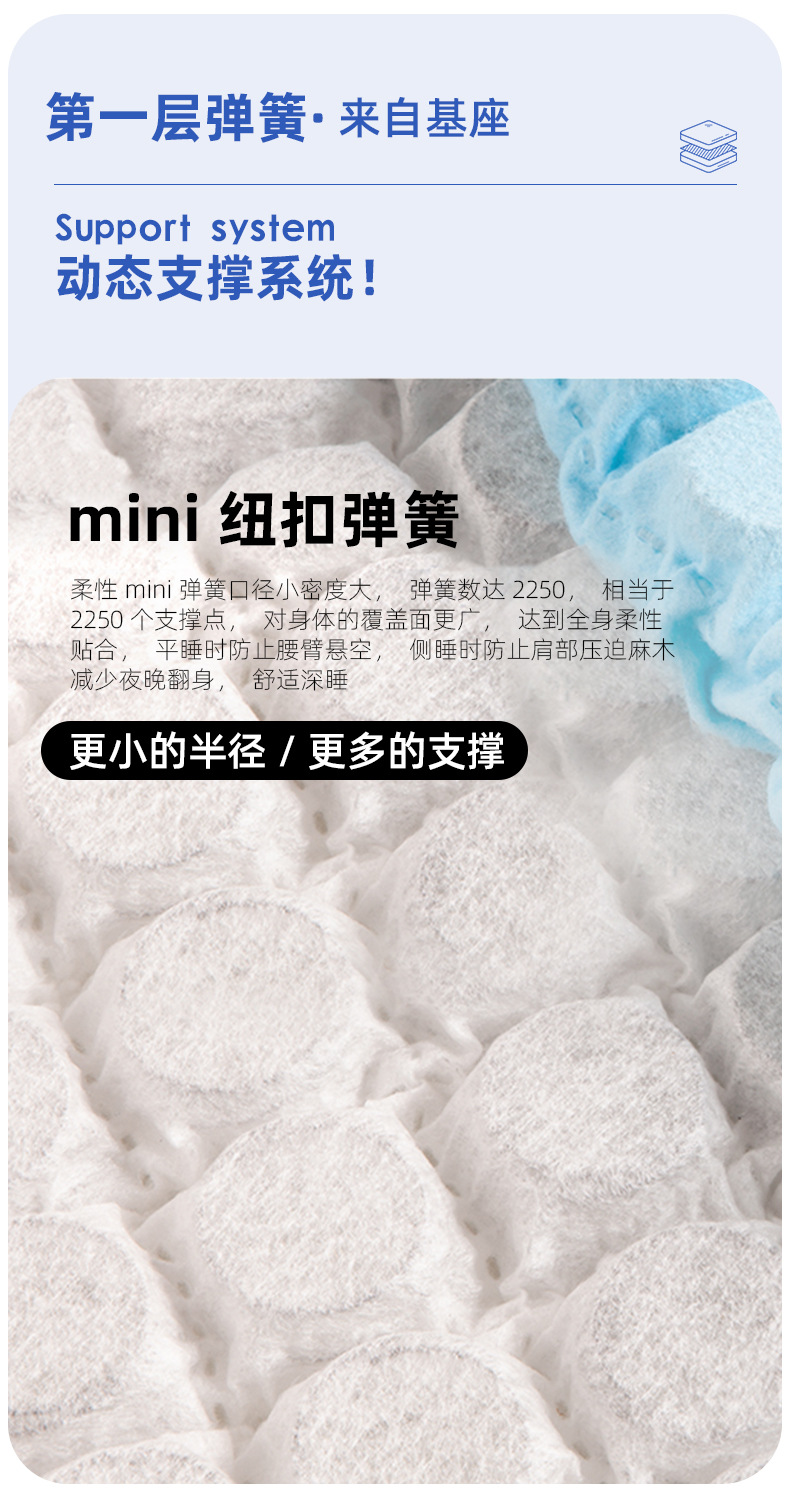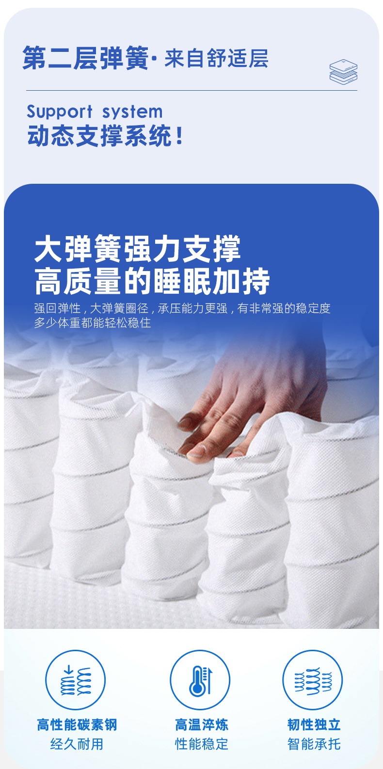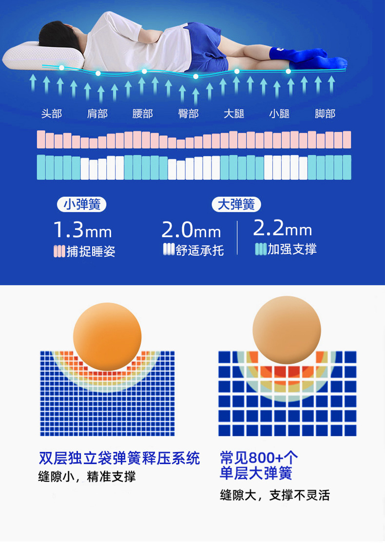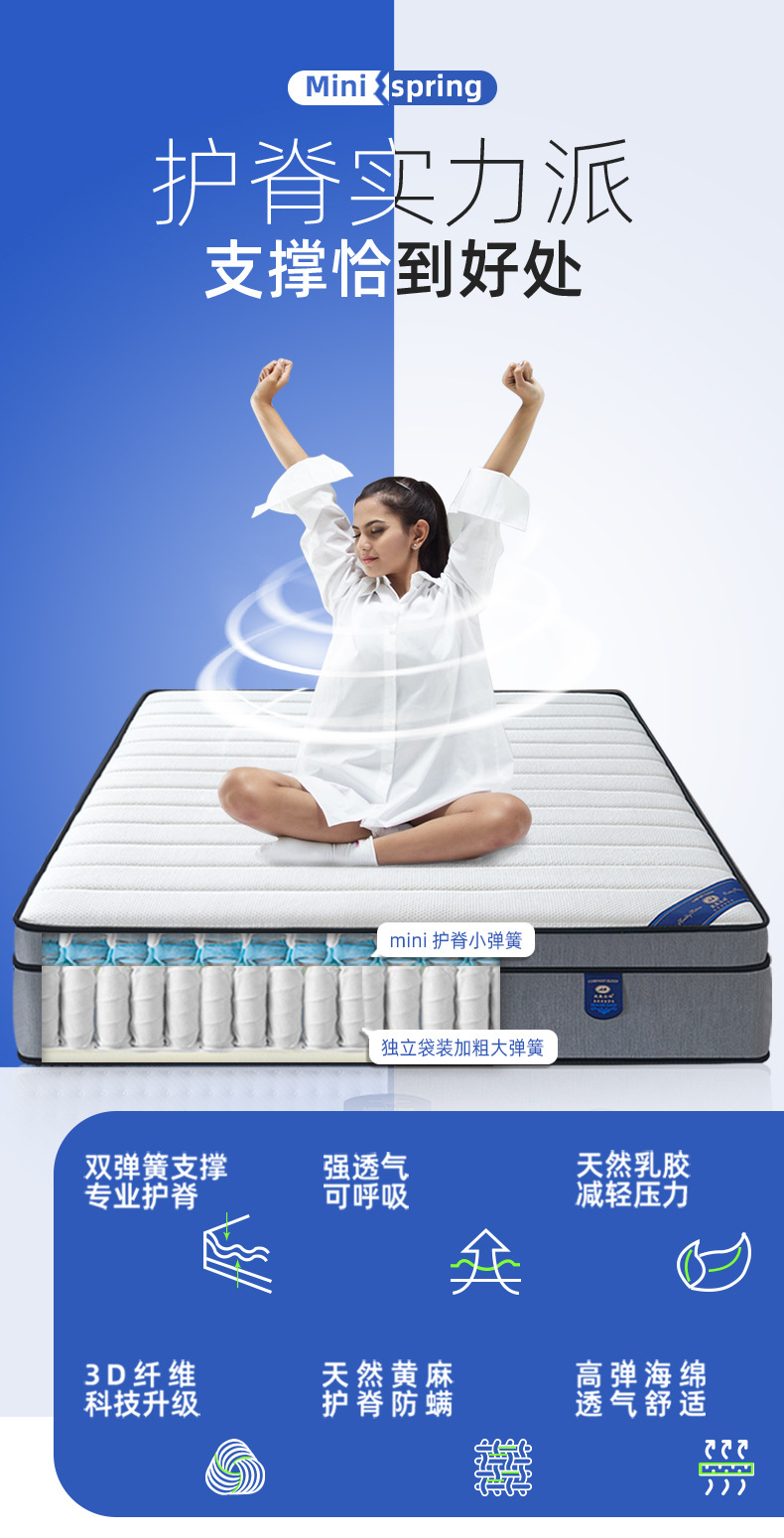 Тип A (22 см, умеренная твердость и мягкость): ткань против клещей + мини-пружина на пуговицах + закаленная независимая пружина сумки + 3D дышащая ткань; Тип B (24 см, ощущение мягкого сна): ткань против клещей + латекс 2 см + мини-пружина на пуговицах + закаленная независимая пружина сумки + 3D дышащая ткань; Тип C (24 см, умеренный и немного мягкий): ткань против клещей + материал 2 см3D + пружина с мини-кнопками + закаленная независимая пружина сумки + 3D дышащая ткань; Тип D (24 см, умеренный и слегка твердый): ткань против клещей + пружина с мини-ґудзиками + джут толщиной 2 см + закаленная независимая пружина сумки + 3D дышащая ткань; Модель двойного назначения 24 см: ткань против клещей + латекс 2 см + пружина мини-кнопок + закаленная независимая пружина сумки + 2 см3D-материал + 3D-дышащая ткань