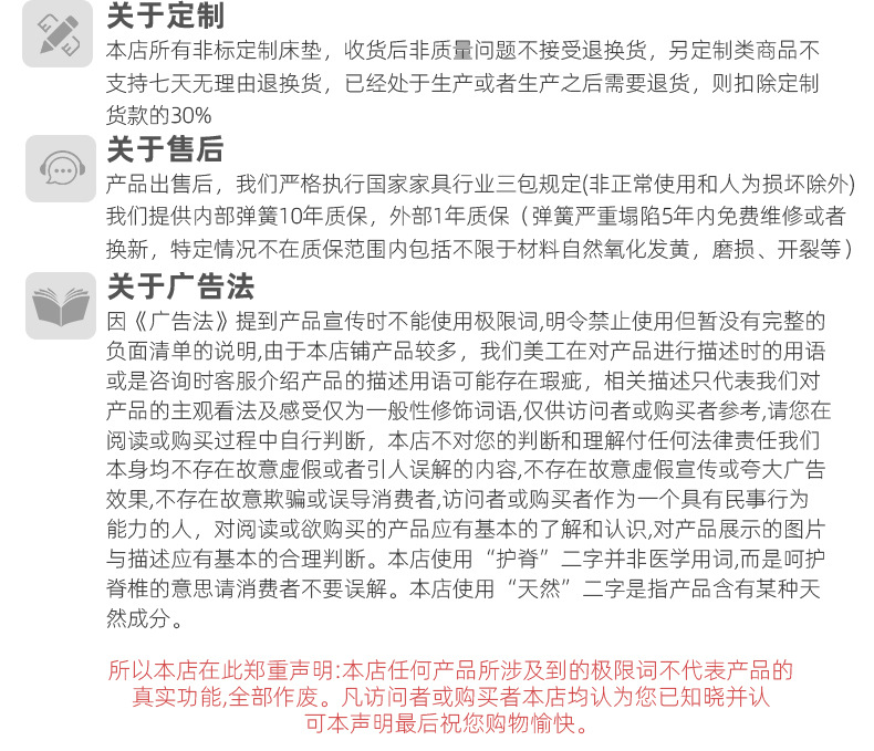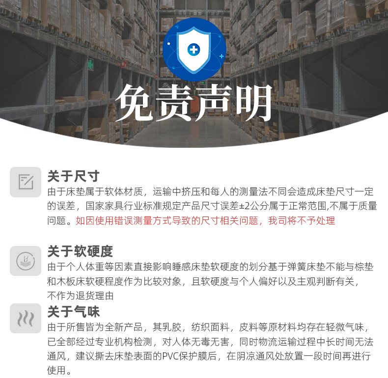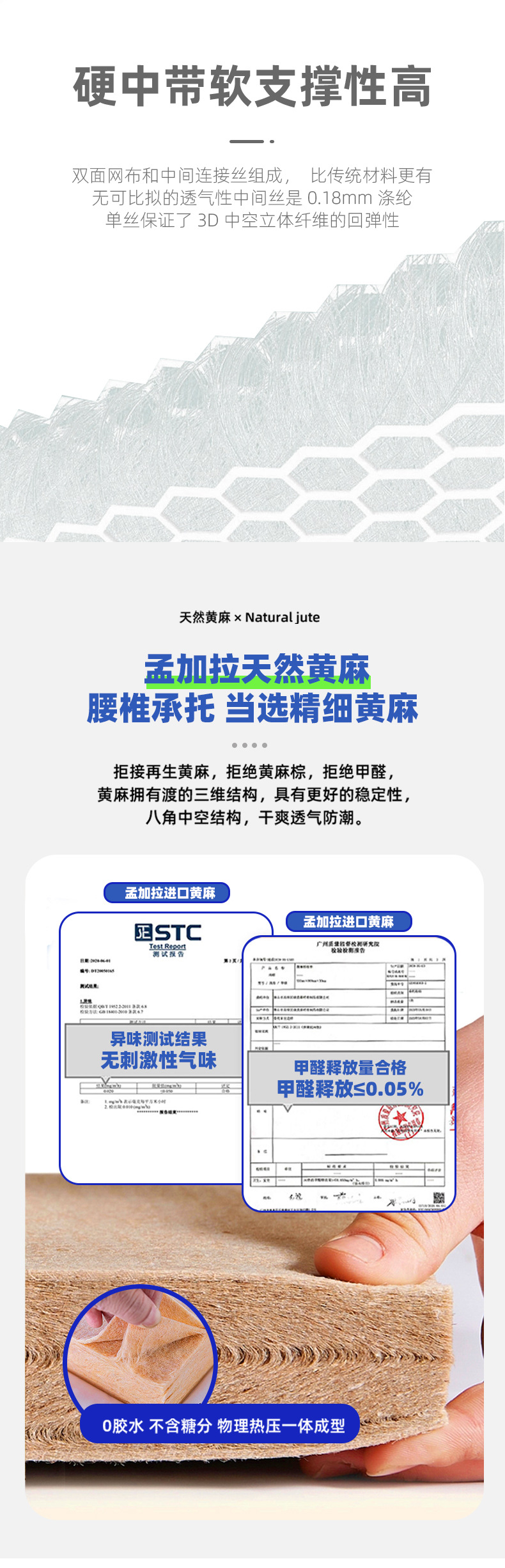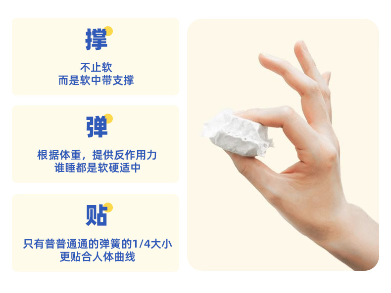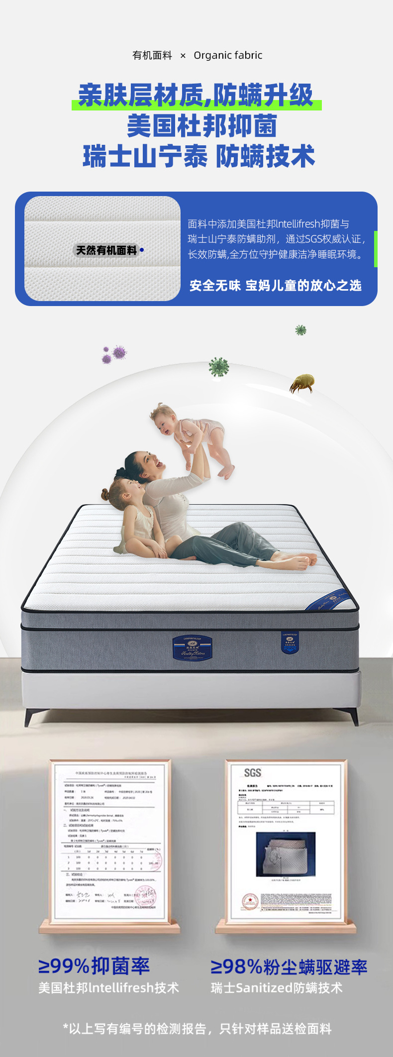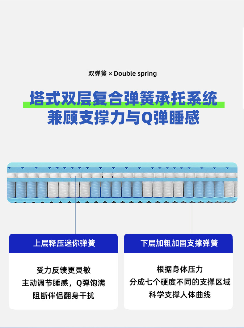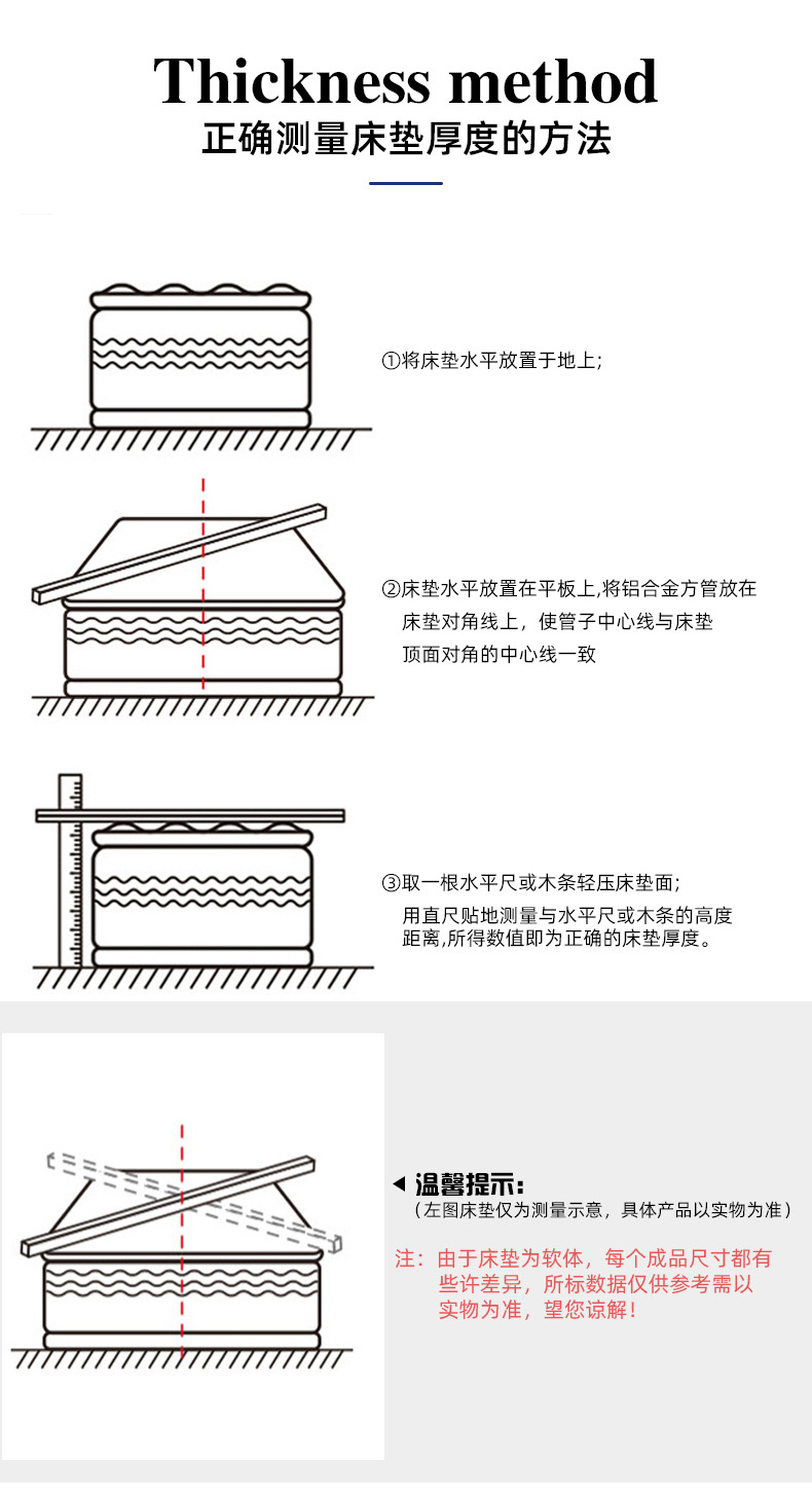Тип A (22 см, умеренная твердость и мягкость): ткань против клещей + мини-пружина на пуговицах + закаленная независимая пружина сумки + 3D дышащая ткань; Тип B (24 см, ощущение мягкого сна): ткань против клещей + латекс 2 см + мини-пружина на пуговицах + закаленная независимая пружина сумки + 3D дышащая ткань; Тип C (24 см, умеренный и немного мягкий): ткань против клещей + материал 2 см3D + пружина с мини-кнопками + закаленная независимая пружина сумки + 3D дышащая ткань; Тип D (24 см, умеренный и слегка твердый): ткань против клещей + пружина с мини-ґудзиками + джут толщиной 2 см + закаленная независимая пружина сумки + 3D дышащая ткань; Модель двойного назначения 24 см: ткань против клещей + латекс 2 см + пружина мини-кнопок + закаленная независимая пружина сумки + 2 см3D-материал + 3D-дышащая ткань