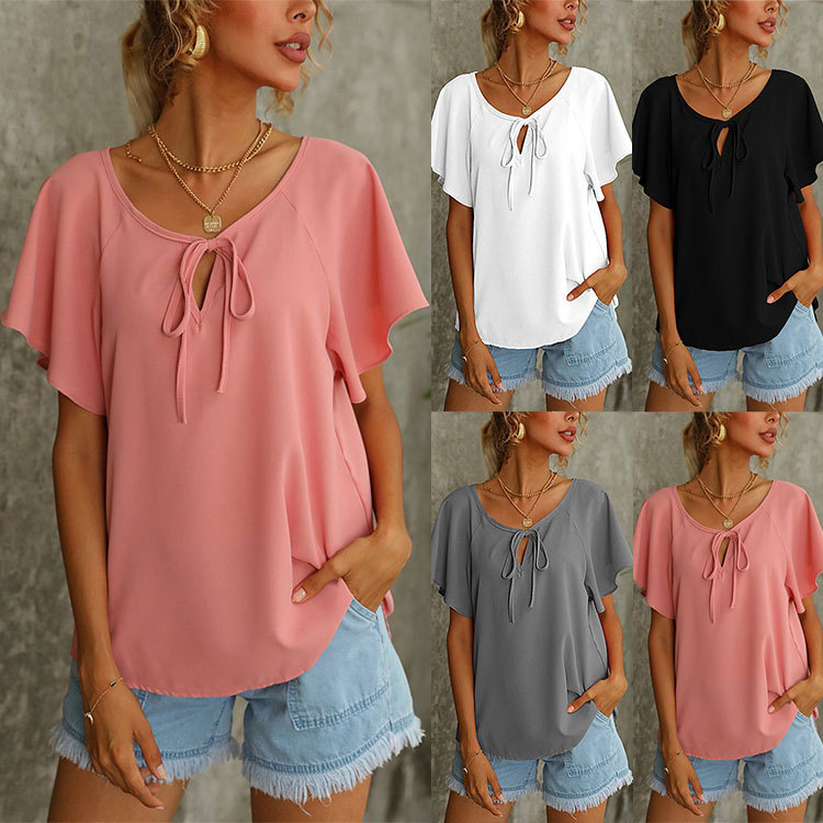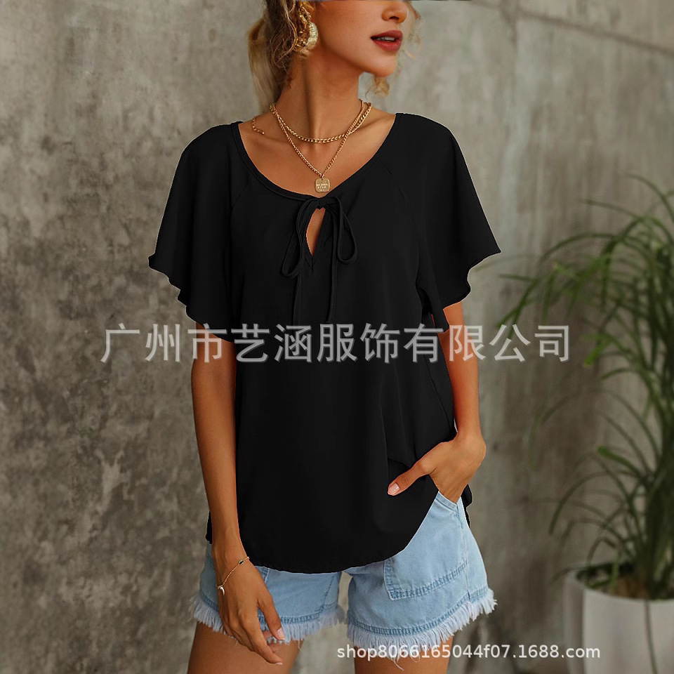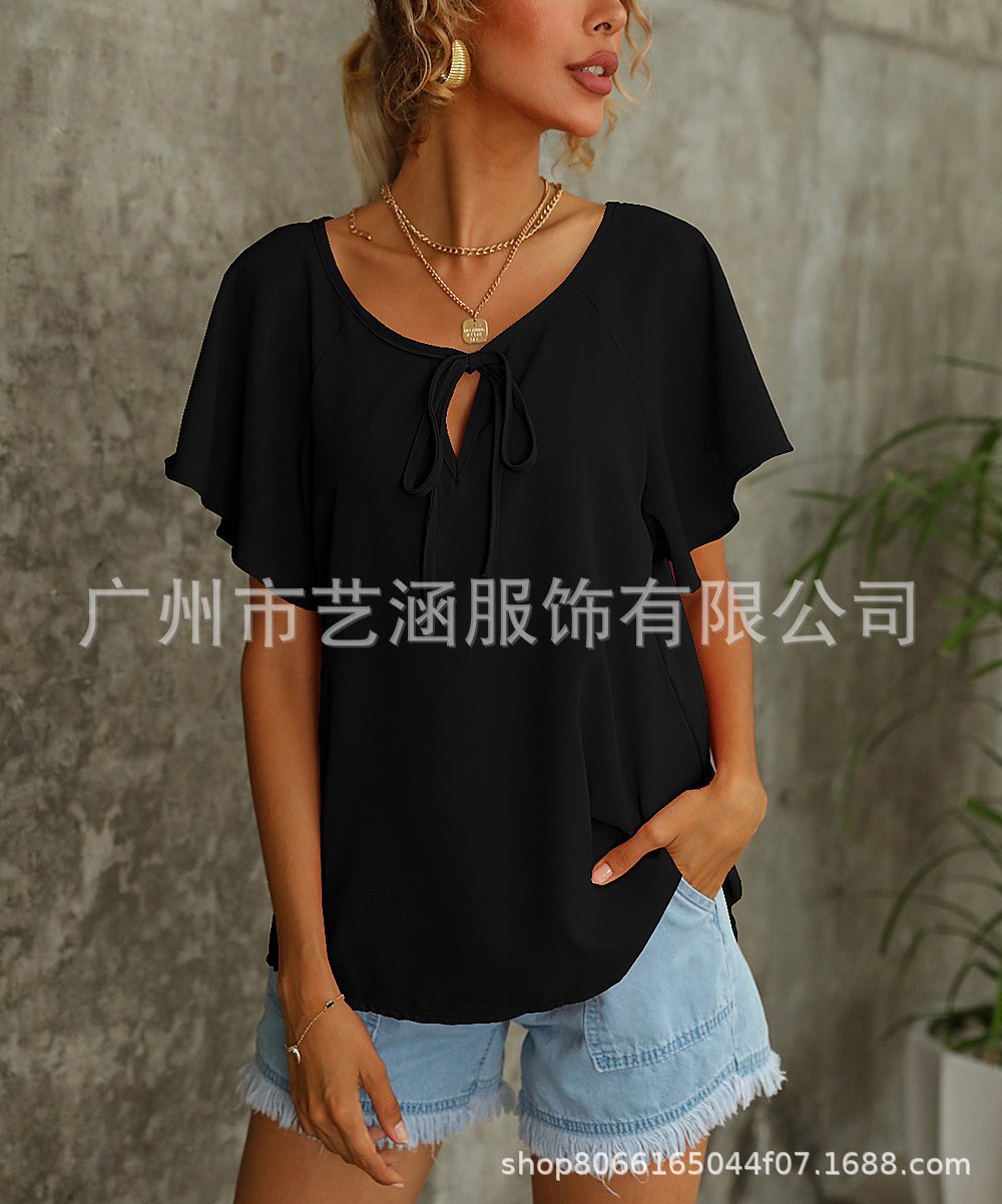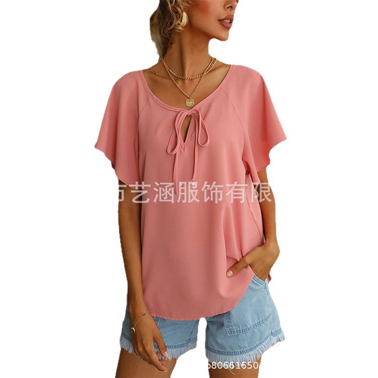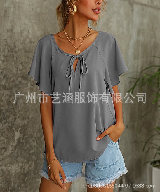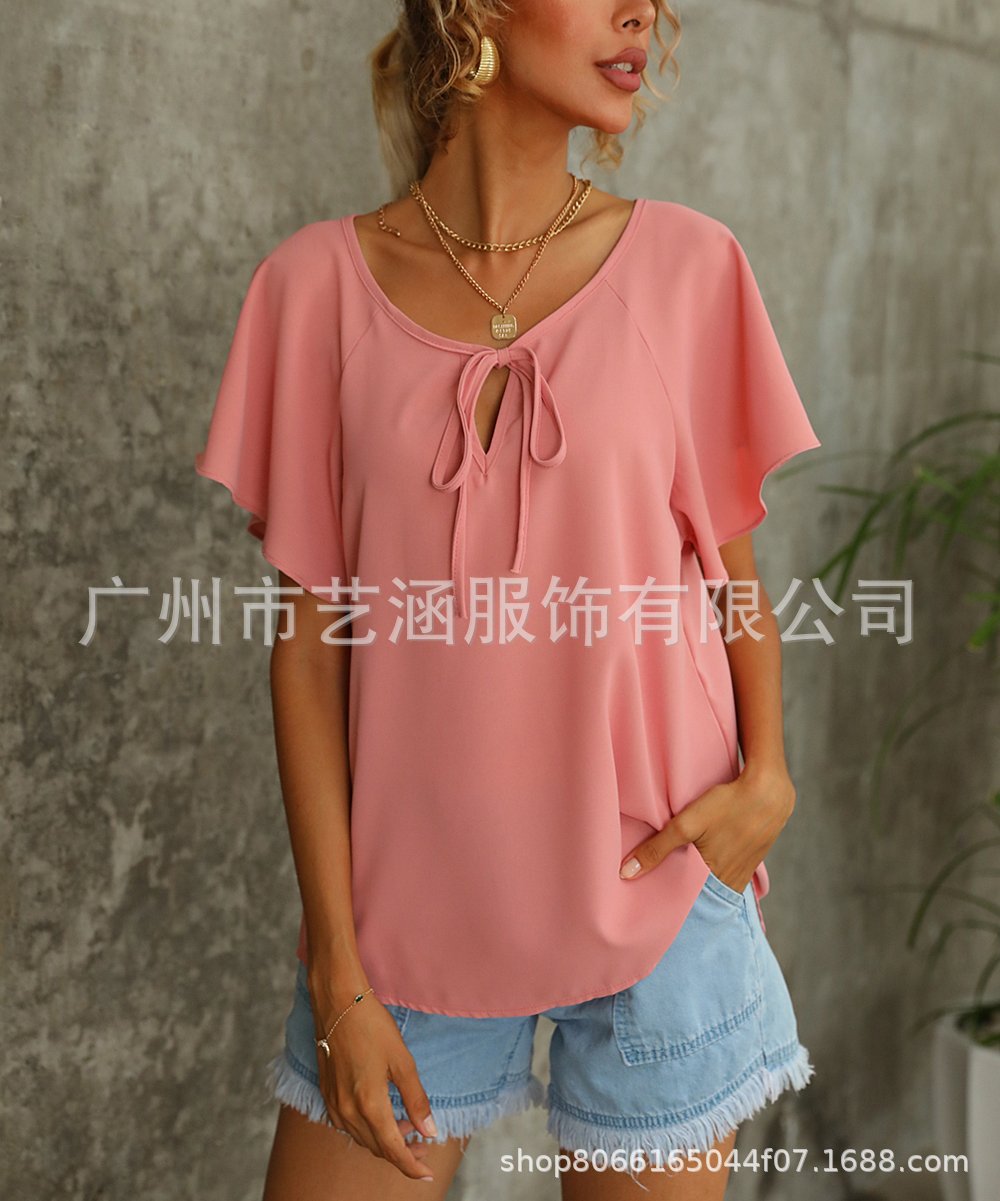 Летние женские модные однотонные топы с V-образным вырезом и коротким рукавом для внешней торговли Amazon в Европе и Америке, коллекция 2025 года