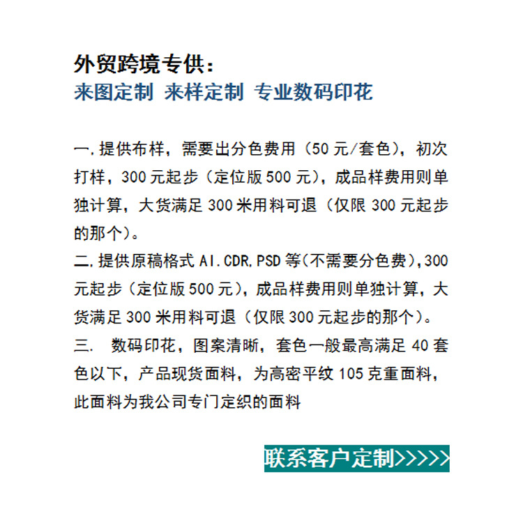 各位总裁,本款链接,面料是我们自己定织的面料,主要向大家展示的是:数码印花类产品,价格因素,在规格,材质,数量,包装等不同要求之下,会产品不同价格,大批量定制,价格从优!