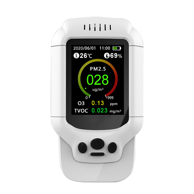 This product is a multifunctional air quality detector that detects Ozone( O3), Total Volatile Organic Compounds (TVOC),Particulate Matter Temperature, and Humidity with clock and record function. As a scientific air quality detection device, it combines multiple air sensors with a built-in fan to allow real-time monitoring of Ozone(O3), total volatile organic compounds (TVOC), PM2.5/1.0/10, temperature, and humidity on its digital LCD display.