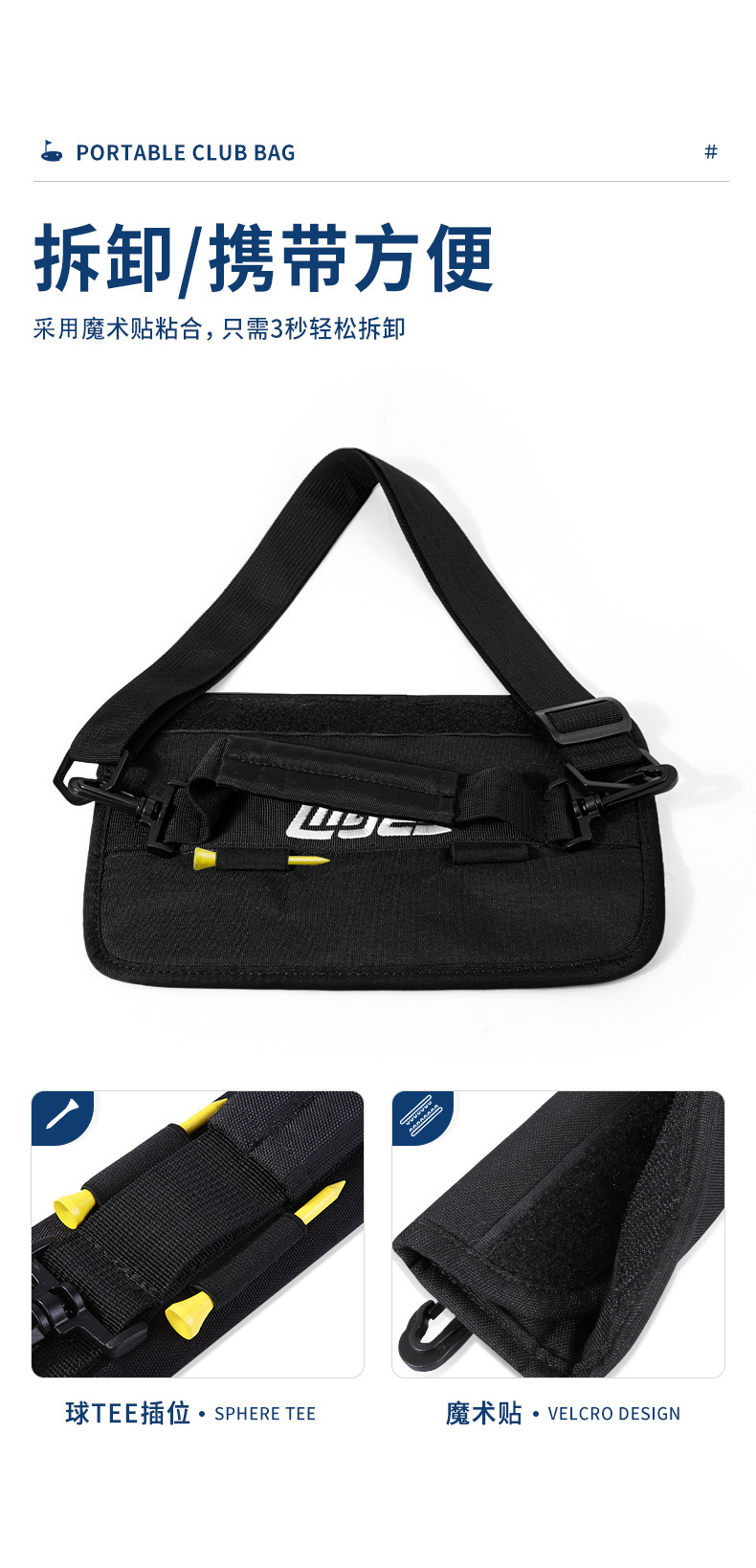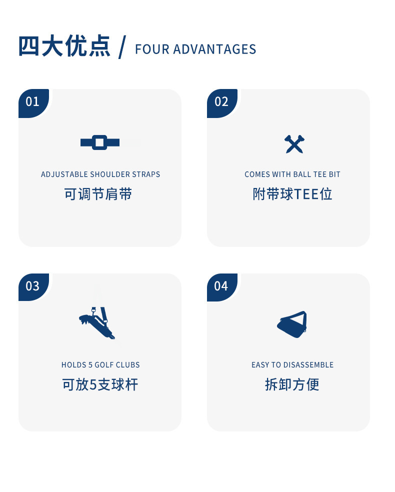 | 产品介绍 | 可调节肩带,附带球TEE位,可放5只球杆,拆卸方便 | |||