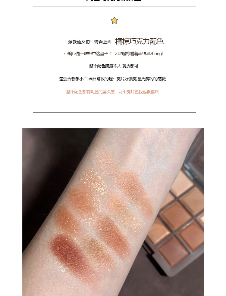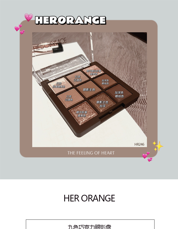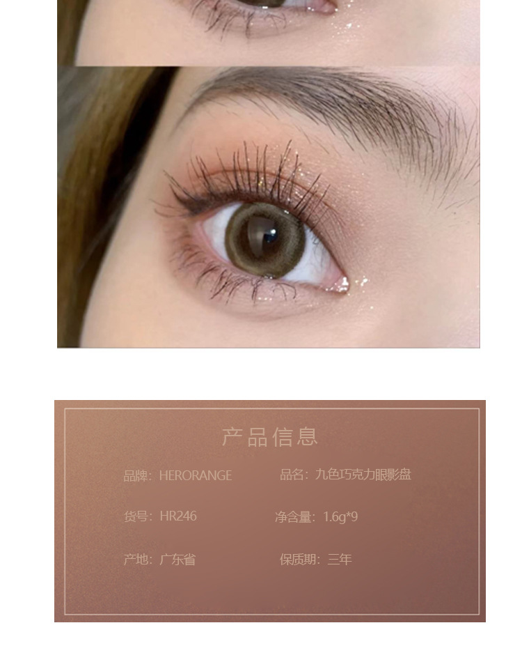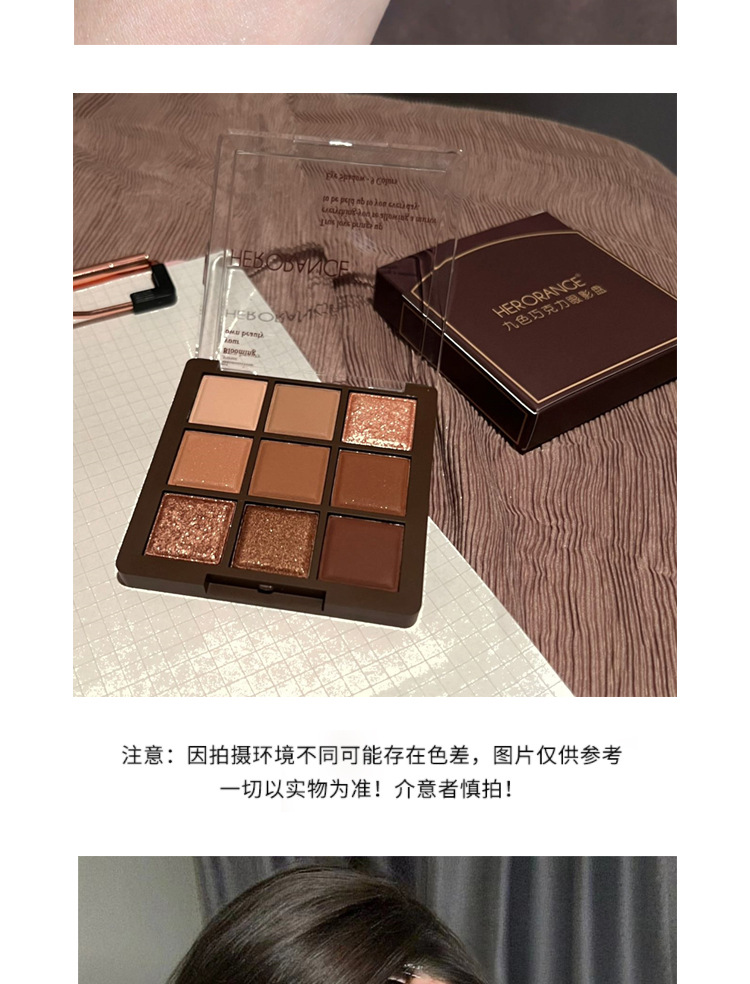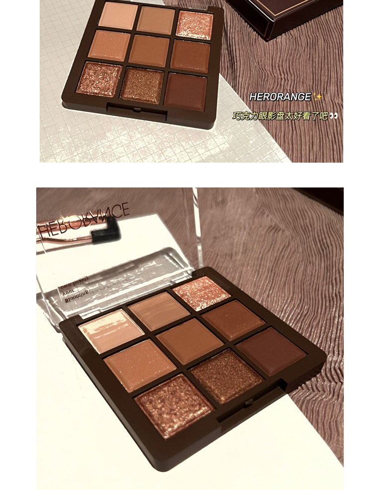Палитра теней для век HERORANGE из девяти оттенков шоколадных оттенков с перламутровым и матовым финишем, крупными блестками и мелким шиммером, доступная для начинающих.