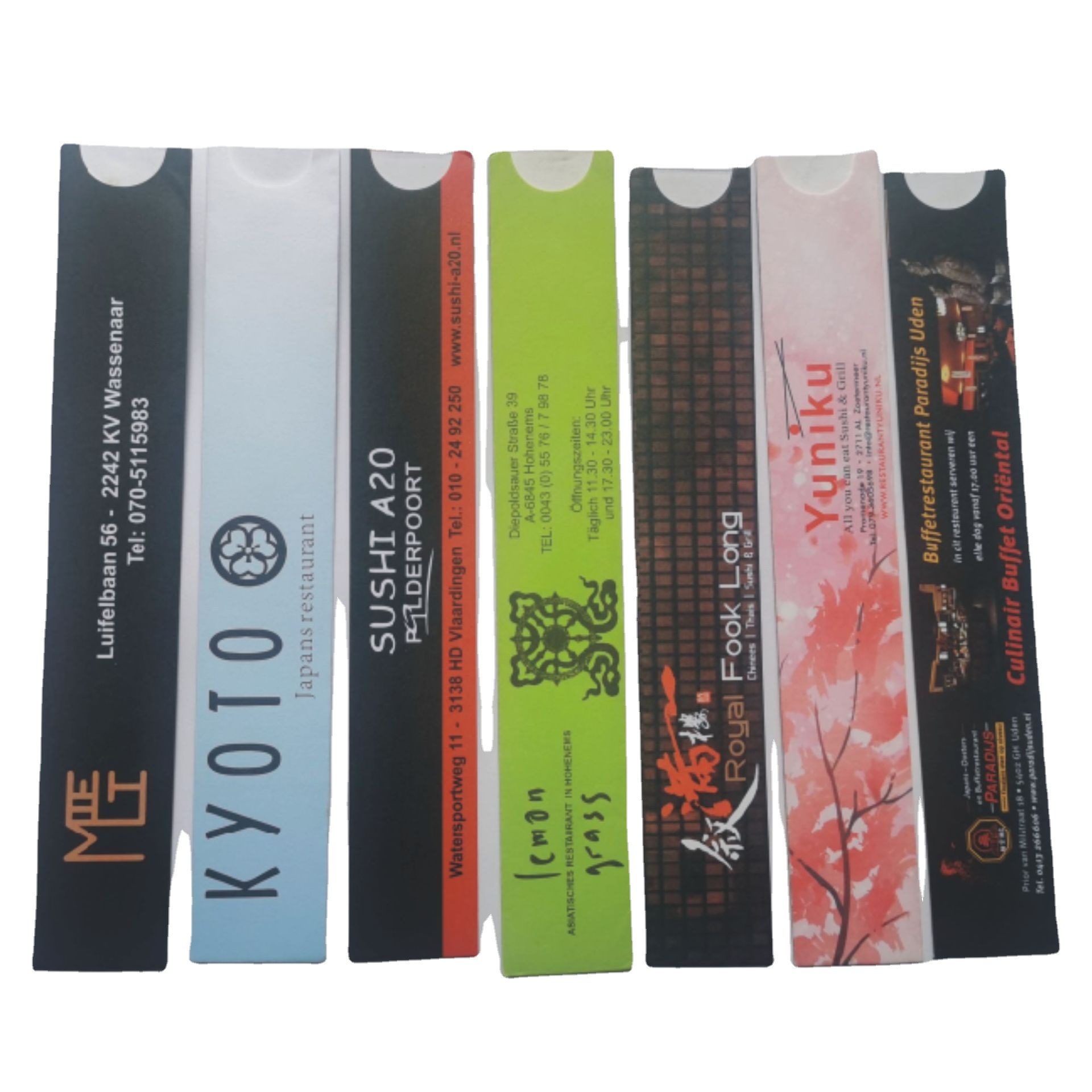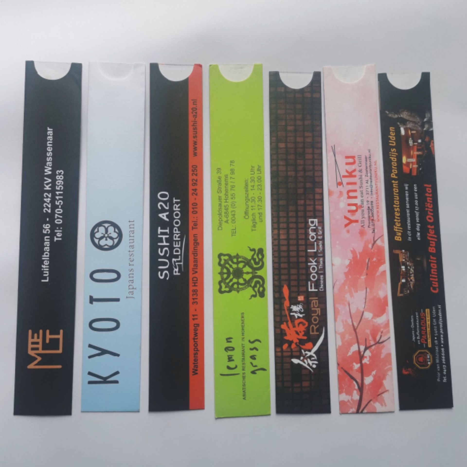 Производитель изготавливает на заказ одноразовые рекламные чехлы для палочек для еды из мелованной бумаги, пакеты для палочек для еды (одинарные и двойные), с логотипом, печатью офсетной печатью, а также чехлы для палочек для еды из мелованной бумаги.
