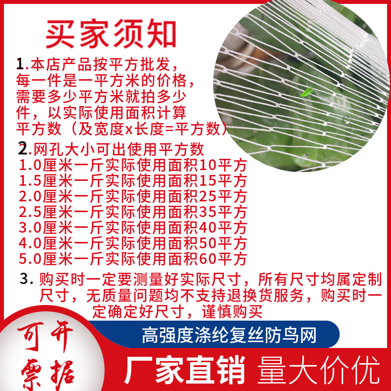 本店温馨提示:本店以锦纶复丝(尼龙复丝)网为主打产品,是平方批发,以实际使用面积计算发货。而不是按理论米数计算发货。理论1平方米=实际使用面积0.7平方米,请供参考。