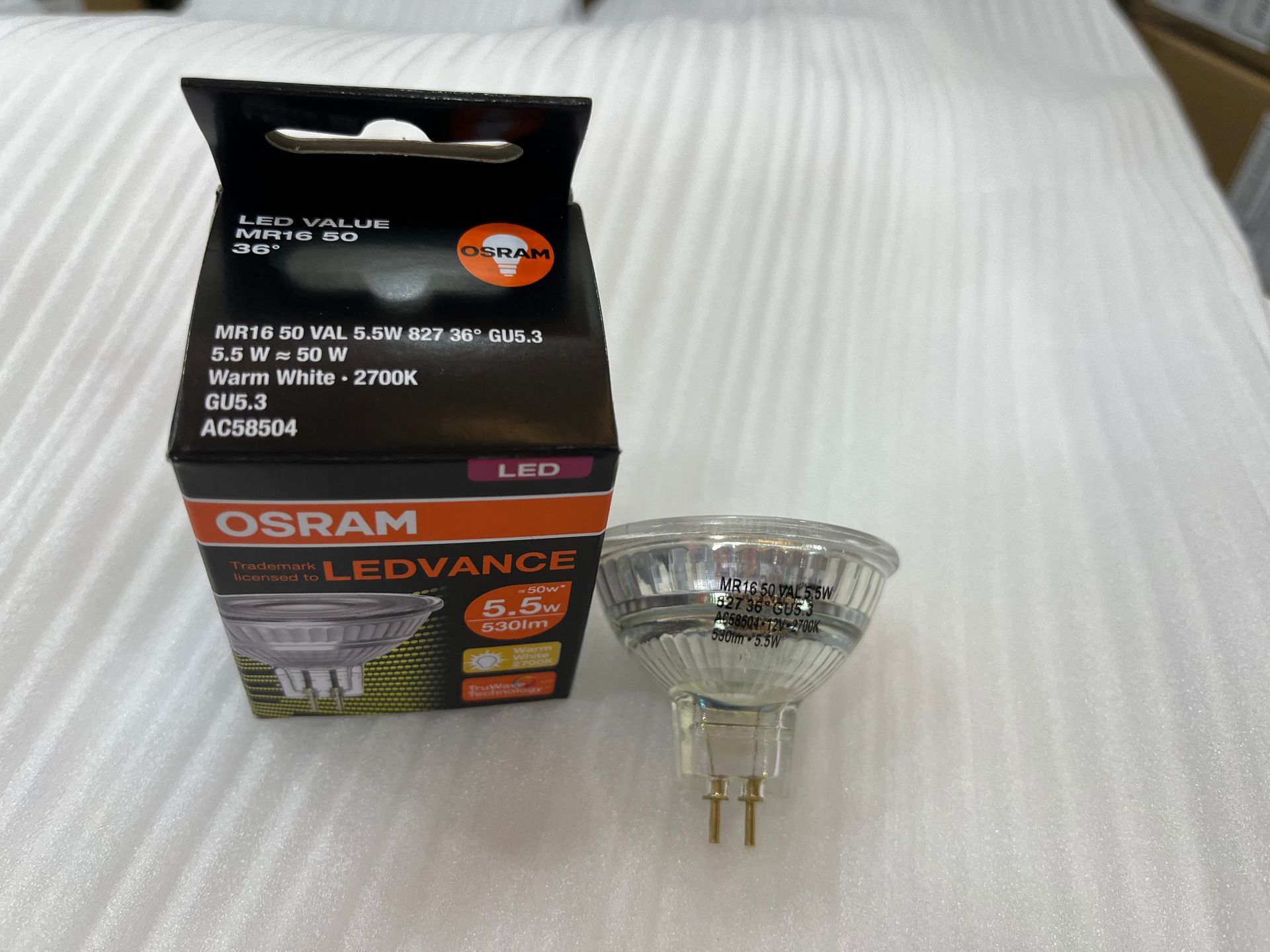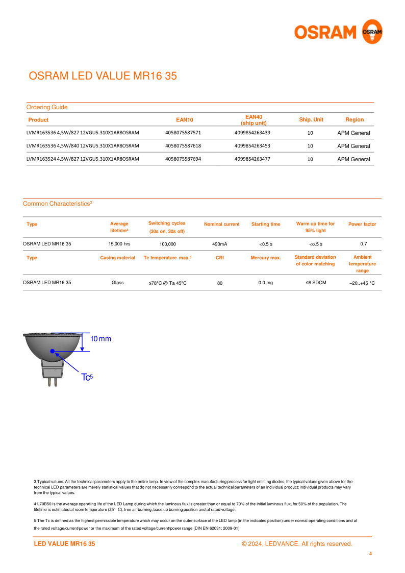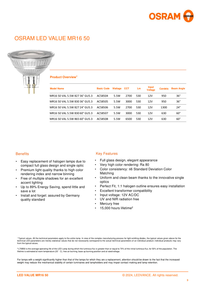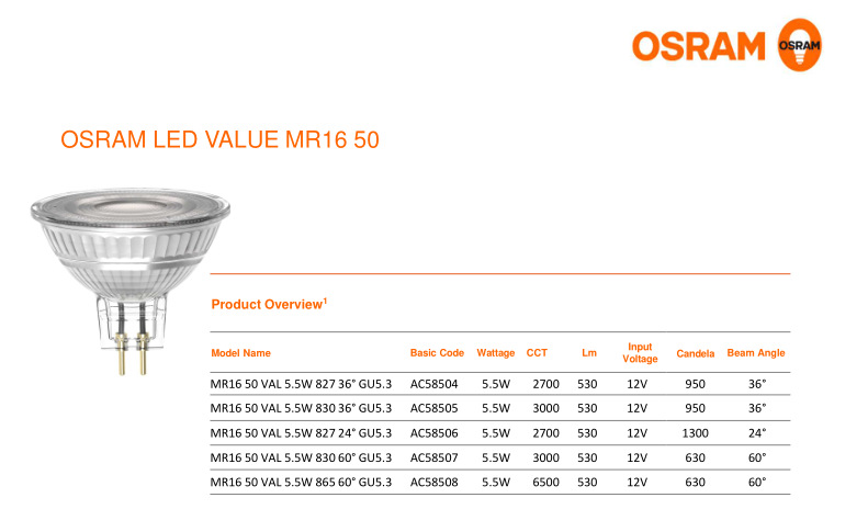 MR163524° 4.5W 2700K; MR163536° 4.5W 2700K; MR163536° 4.5W 4000K; MR165024° 5.5W 2700K; MR165036° 5.5W 2700K; MR165036° 5.5W 3000K