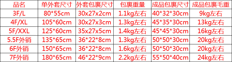 3F/L размер 80х55см; Размер 4F/XL 105x60см; Размер 5F/XXL 125x60см; 5,5F/экспорт 135X65см; 6F/экспорт 150x65см; 7F/экспорт 180x65см