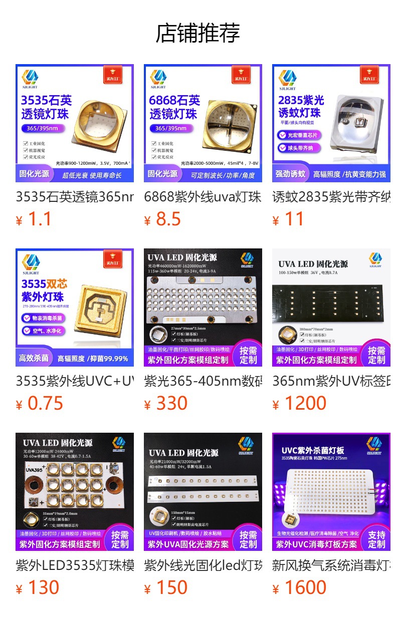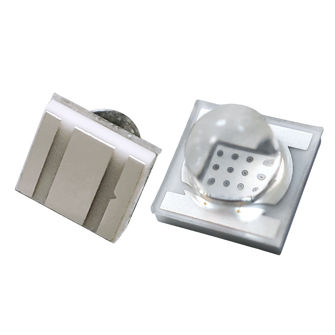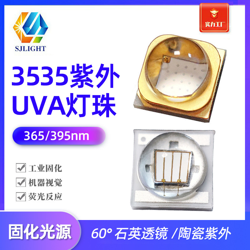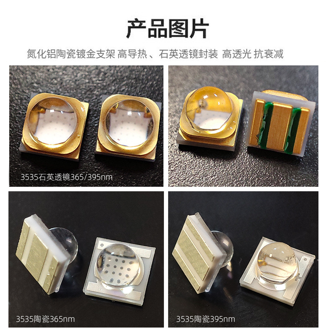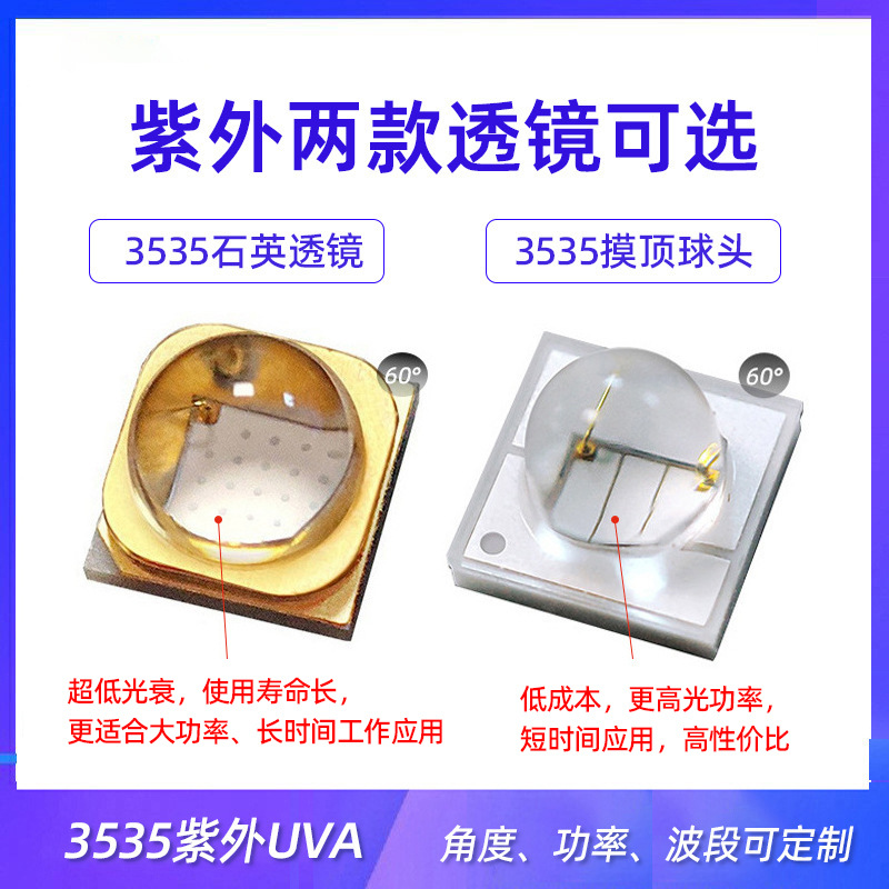 60°紫光石英透镜灯珠,在光学效率、抗老化、耐高温、光斑质量、寿命上,都优于60°陶瓷模顶紫光球头灯珠。