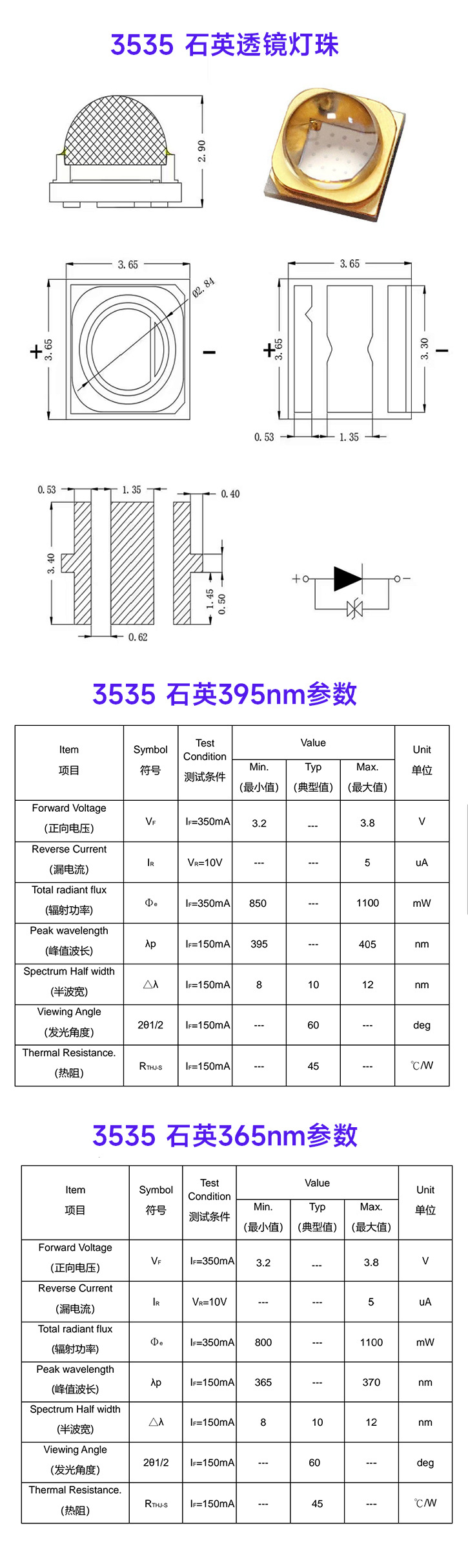 Кварцевая линза 3535, светодиод 3838 для УФ-лампы 365 нм (фиолетовый свет), УФ-лампа 395 нм для машинного зрения и УФ-отверждения