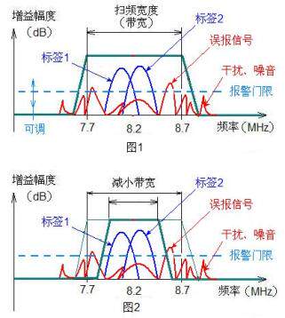 一般对于周围干扰较大的环境,只要适当减小扫频宽度,将它控制在600-800KHz(也就是8.2±0.3-0.4MHz)以内,这样可以解决80%的干扰误报问题,但此时要注意扫频宽度太小,某些频率偏多的软标签就有可能会灵敏度低或不报警,所以要综合平衡这几个参数。