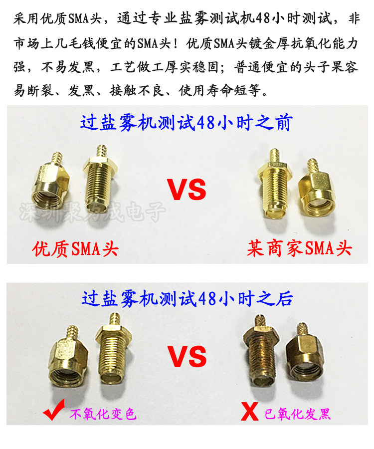 专业天线厂家,座子大厂品牌质量可靠稳定,非OEM私人工厂定制,请放心购买!原材料我们选用大厂品牌上市公司RG316线+全自动同轴剥线机器+专业特制SMA低损衰减小过48H盐雾测试+多年生产技术辅佐+严格工厂品质管控公司配套测试工具齐全+日生产效率均高达2万条以上!因您需要,刚好我们专业!