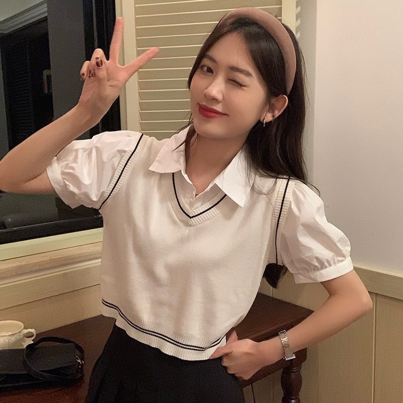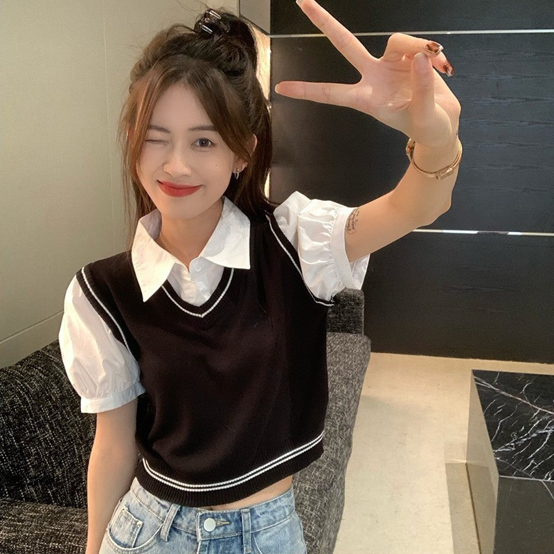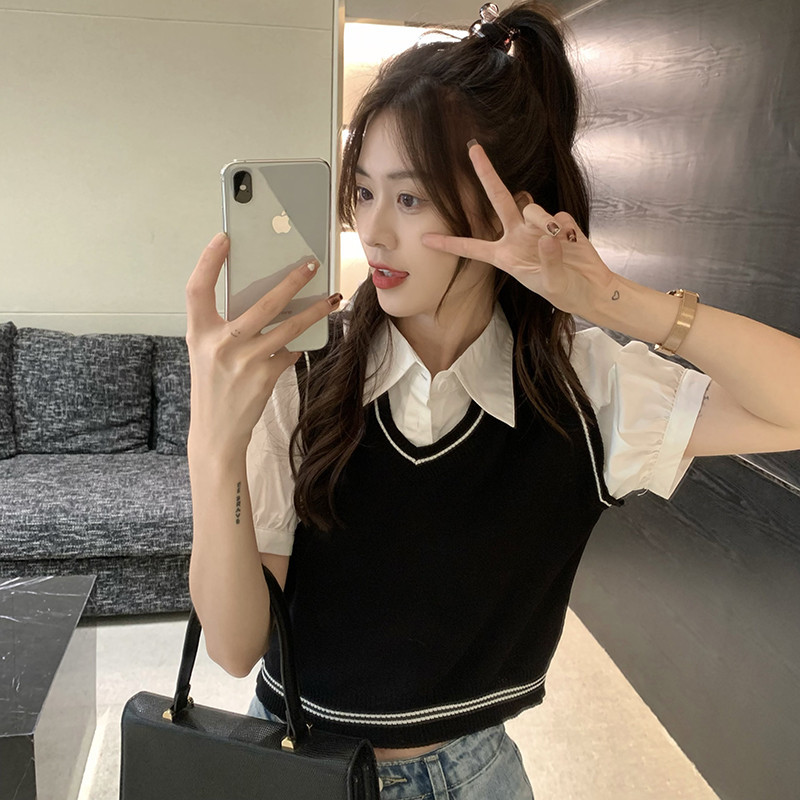 Поддельные две короткие рубашки женская летняя 2022 новый дизайн Конструктор сшивания тонкая рубашка с короткими рукавами