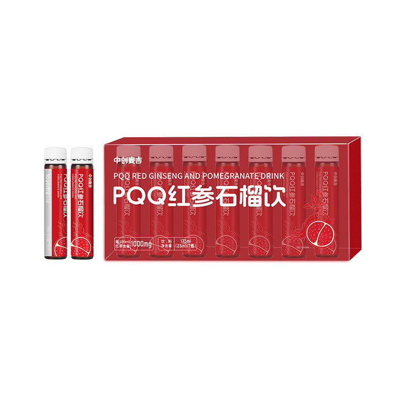 PQQ напиток с красным женьшенем и гранатом, жидкая форма для перорального приема, OEM-производство с добавлением лонган, красных фиников, желатина из свиных кишечных слизней, обработка напитка с красным женьшенем и гранатом.